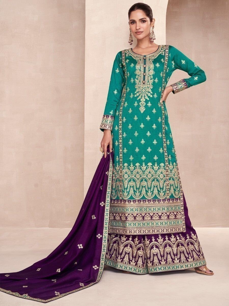 Adorable Aqua Blue Embroidered Silk Festive Wear Palazzo Suit