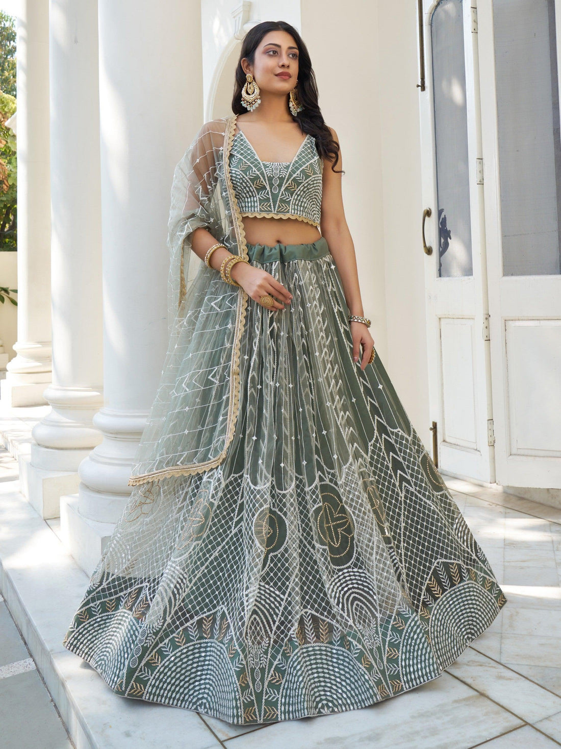 Enchanting Dusty Green Thread Work Net Bridesmaid Lehenga Choli
