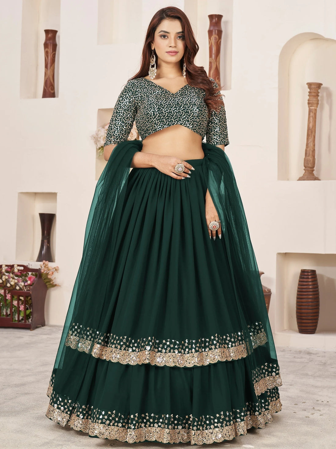 Attractive Green Sequins Georgette Lehenga Choli With Dupatta