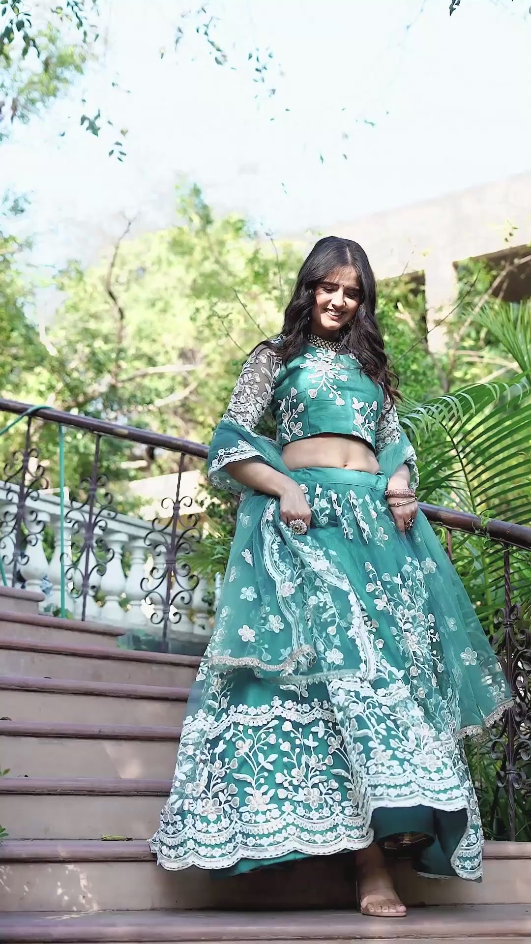 Beautiful Teal Blue Thread Embroidered Net Designer Lehenga Choli