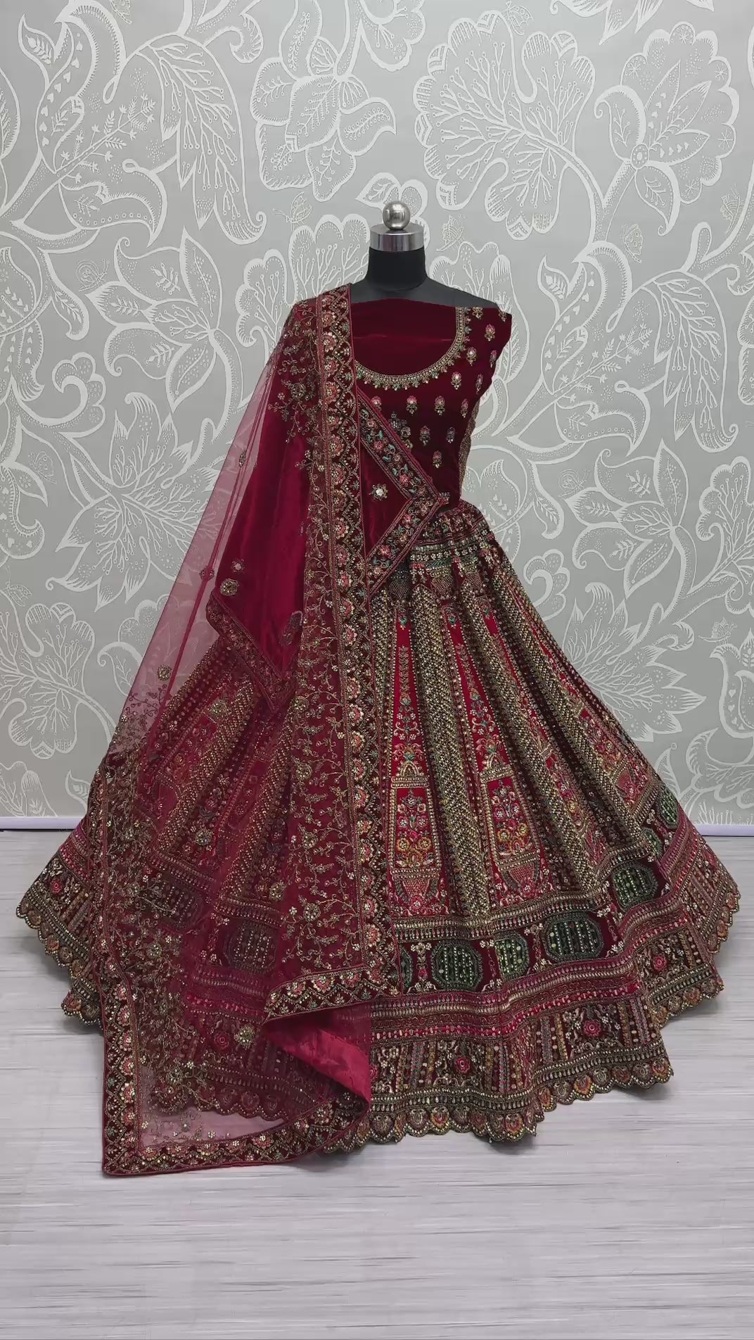 Great Red Thread Work Velvet Bridal Lehenga Choli With Double Dupatta - Zeel Clothing