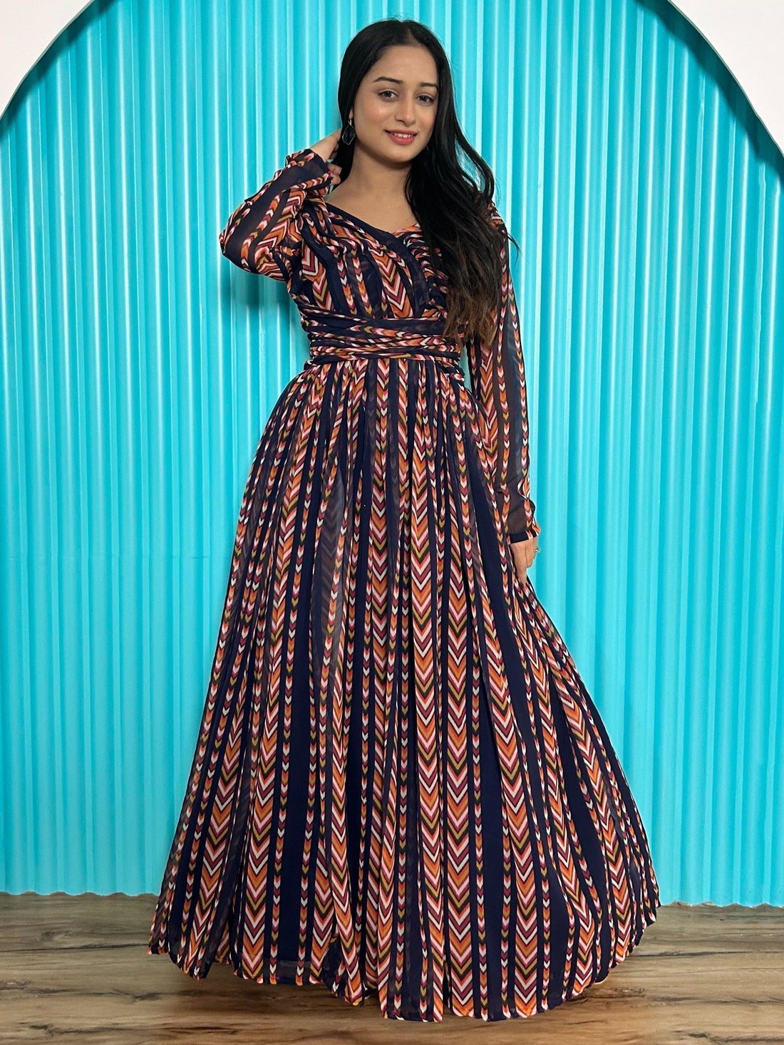 Alluring Navy-Blue & Orange Digital Printed Georgette Designer Gown