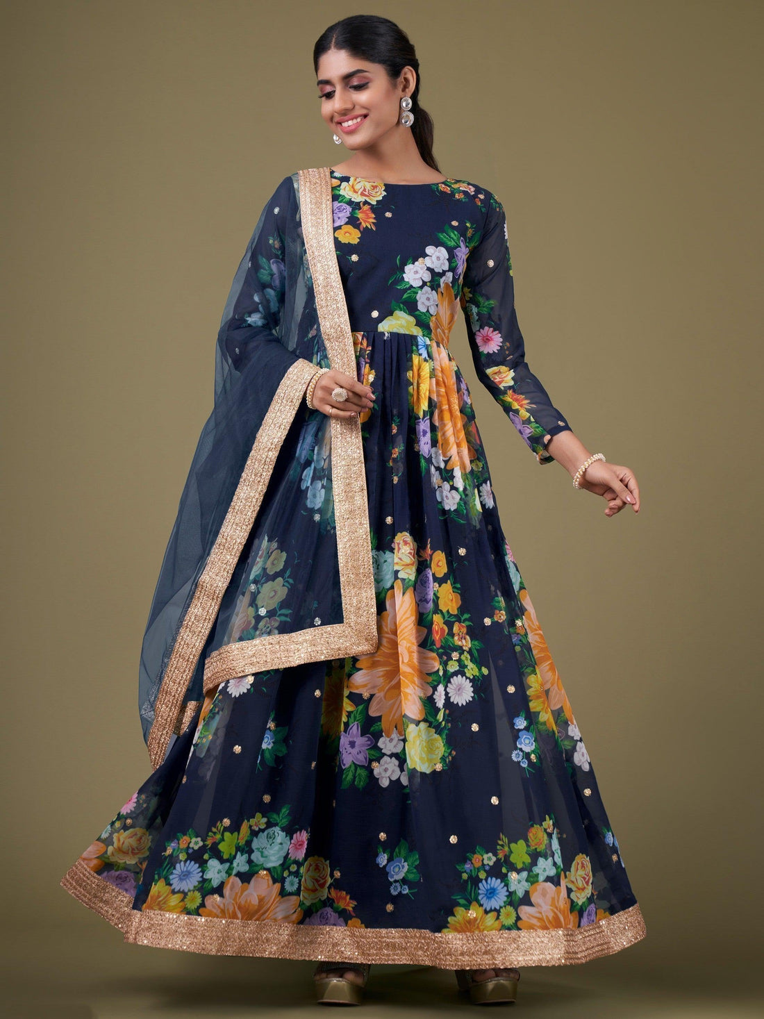 Stunning Navy Blue Floral Printed Georgette Gown With Dupatta