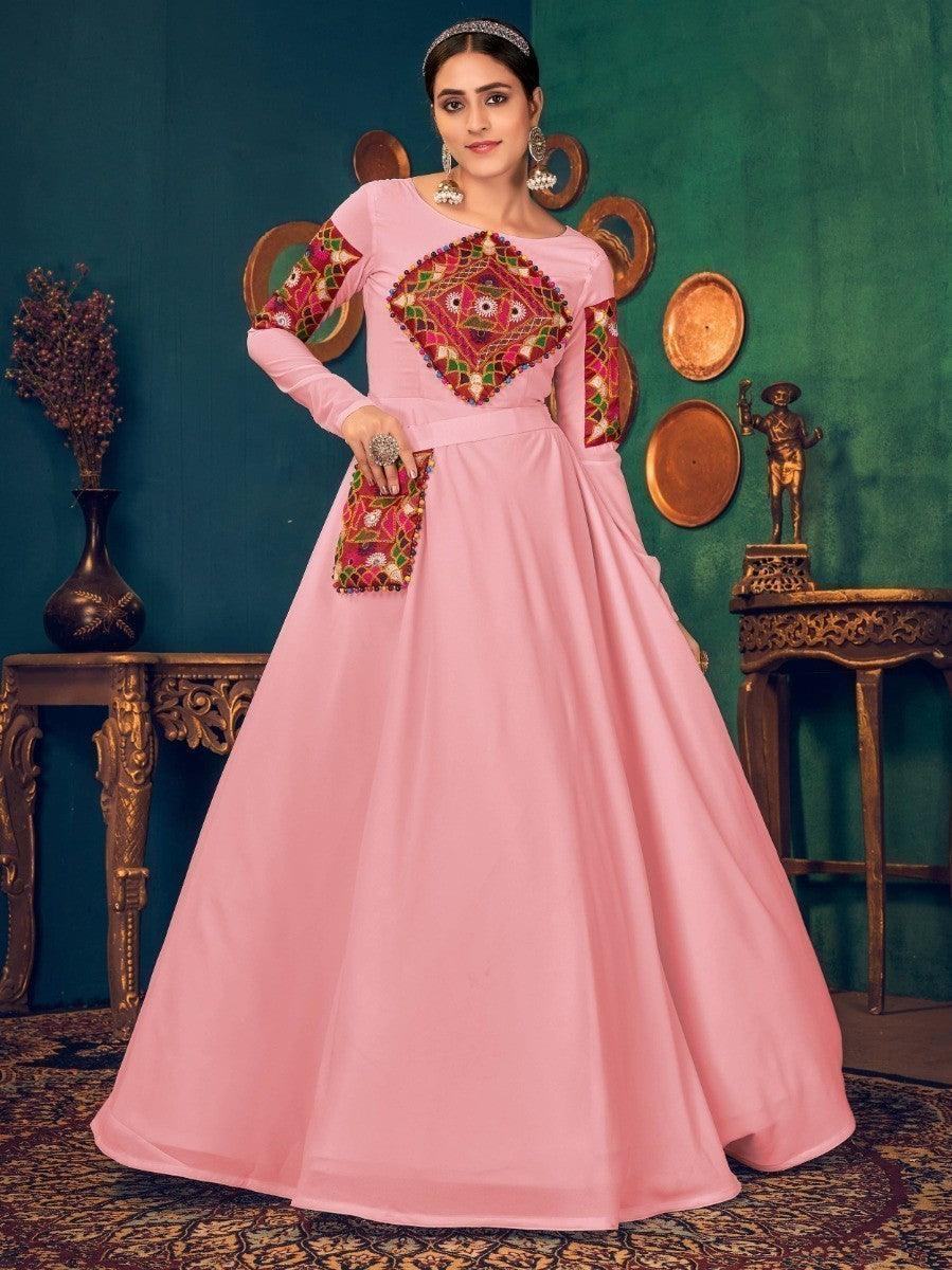 Stupendous Pink Mirror And Pearl Work Georgette Festive Wear Gown