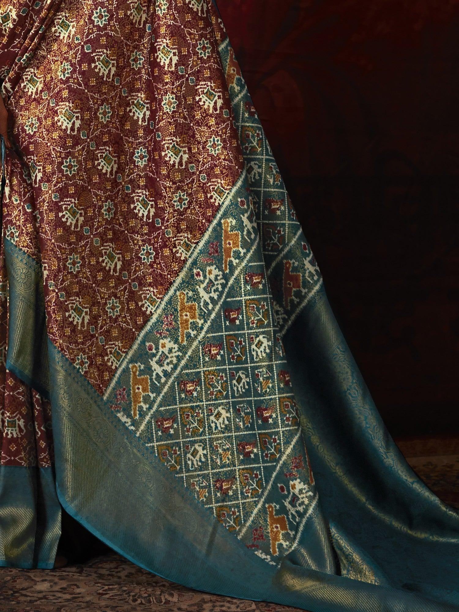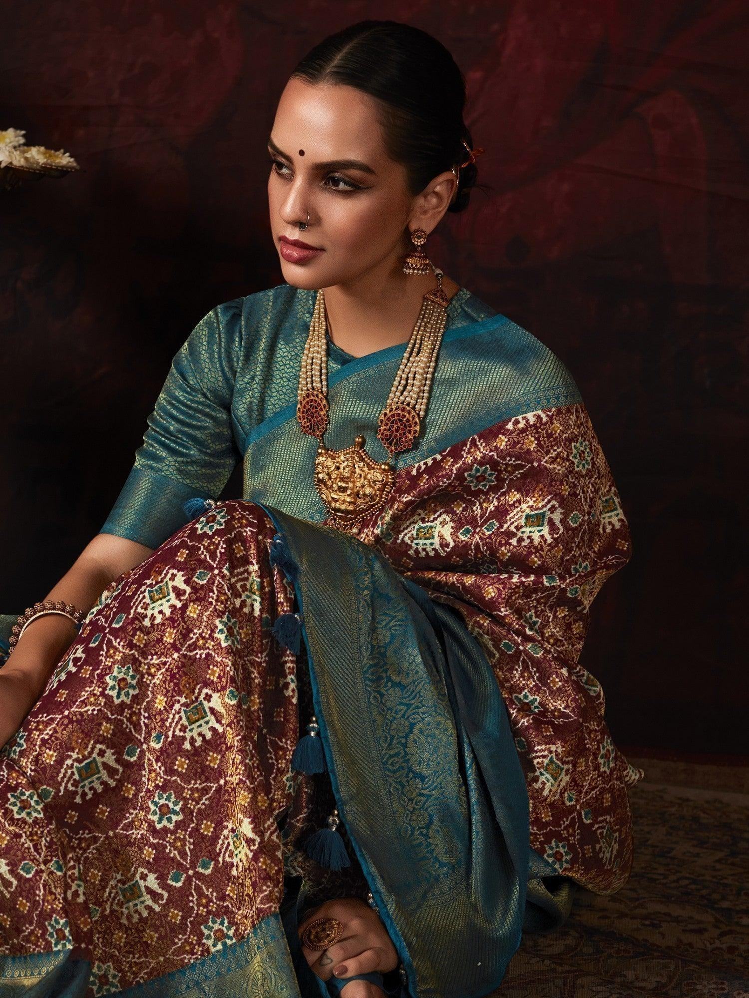 • Add a touch of elegance and tradition to your wardrobe with our adorable brown patola printed silk traditional saree with blouse. This stunning saree features a beautiful brown color silk material adorned with intricate patola print work and exquisite zari weaving. The accompanying blue color silk blouse with zari weaving work complements the saree perfectly, creating a cohesive and sophisticated look.