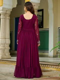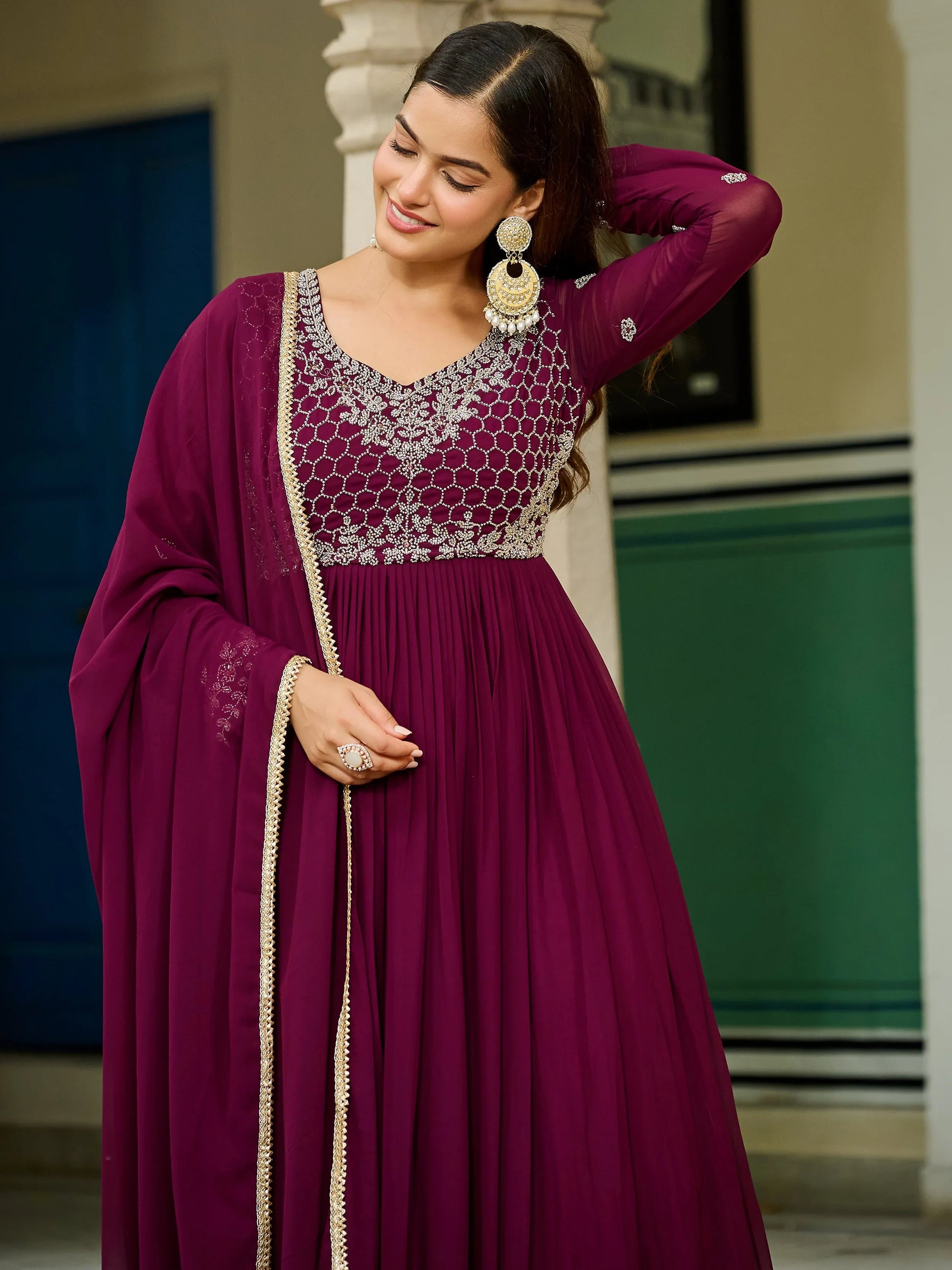 • The gown showcases a rich wine hue crafted in flowy georgette, designed with a flattering Pan V-neckline and elegant full sleeves. Its 56-inch length and impressive 7-meter flair create a beautifully voluminous silhouette that moves effortlessly. A full cotton lining from top to bottom ensures comfort, structure, and easy wear for long hours.