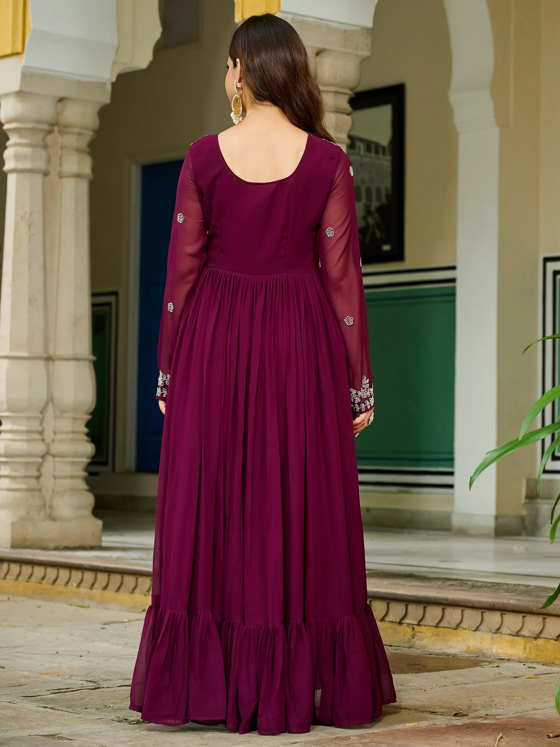 • This maroon georgette gown features a Pan V-neckline, full sleeves, a 56-inch length, a grand 7-meter flair, and a full cotton lining for comfort.