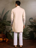 • This elegant beige kurta, crafted from fine viscose silk, showcases intricate thread and sequin embroidery with graceful bird motifs on the upper half and detailed elephant and foliage designs along the hem and sleeves. The mandarin collar, button placket, and full sleeves complete its refined traditional look.