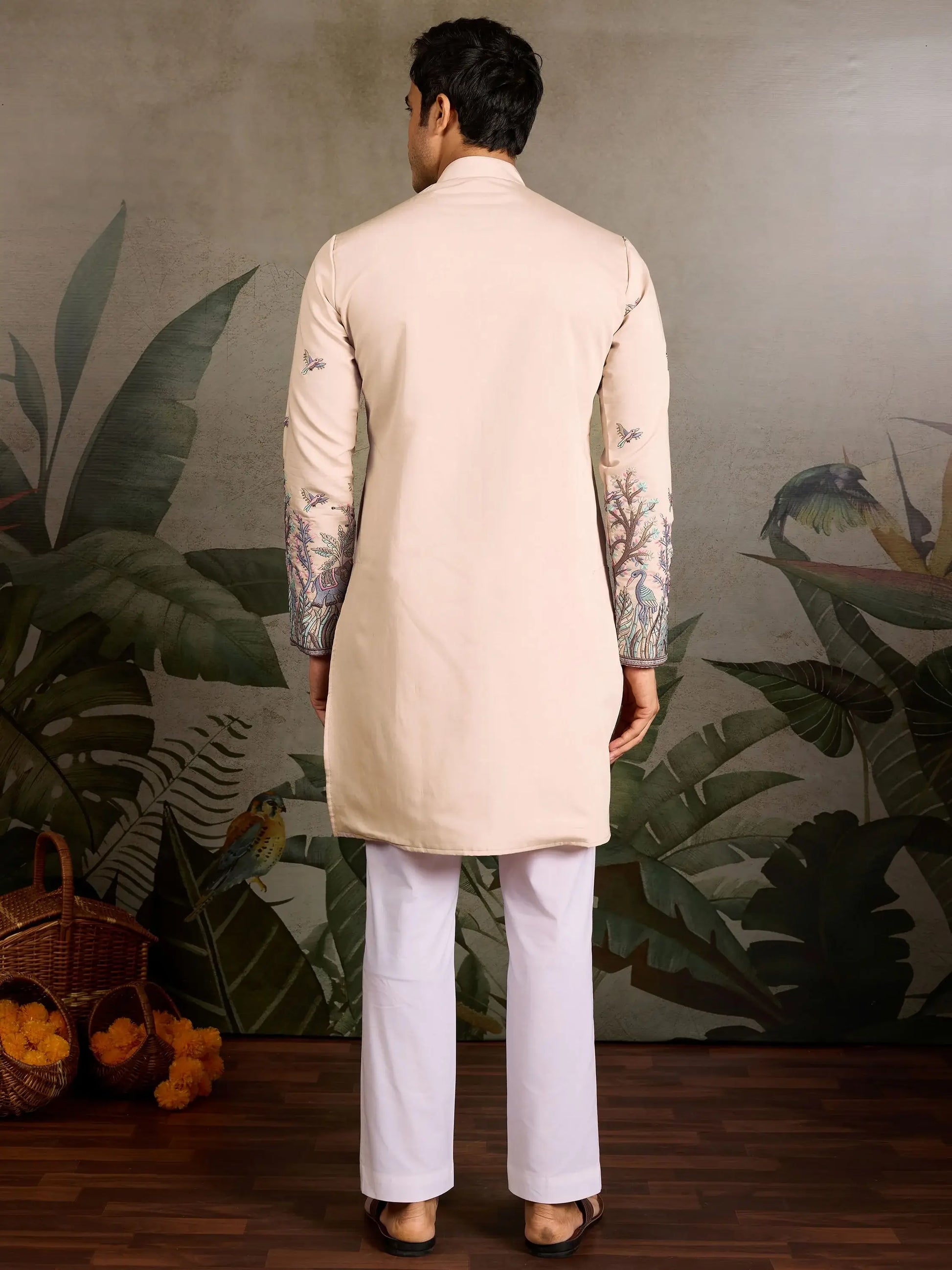 • This beige viscose silk kurta features thread and sequin embroidery with bird, elephant, and foliage motifs, complemented by a mandarin collar and full sleeves for a classic elegant look.