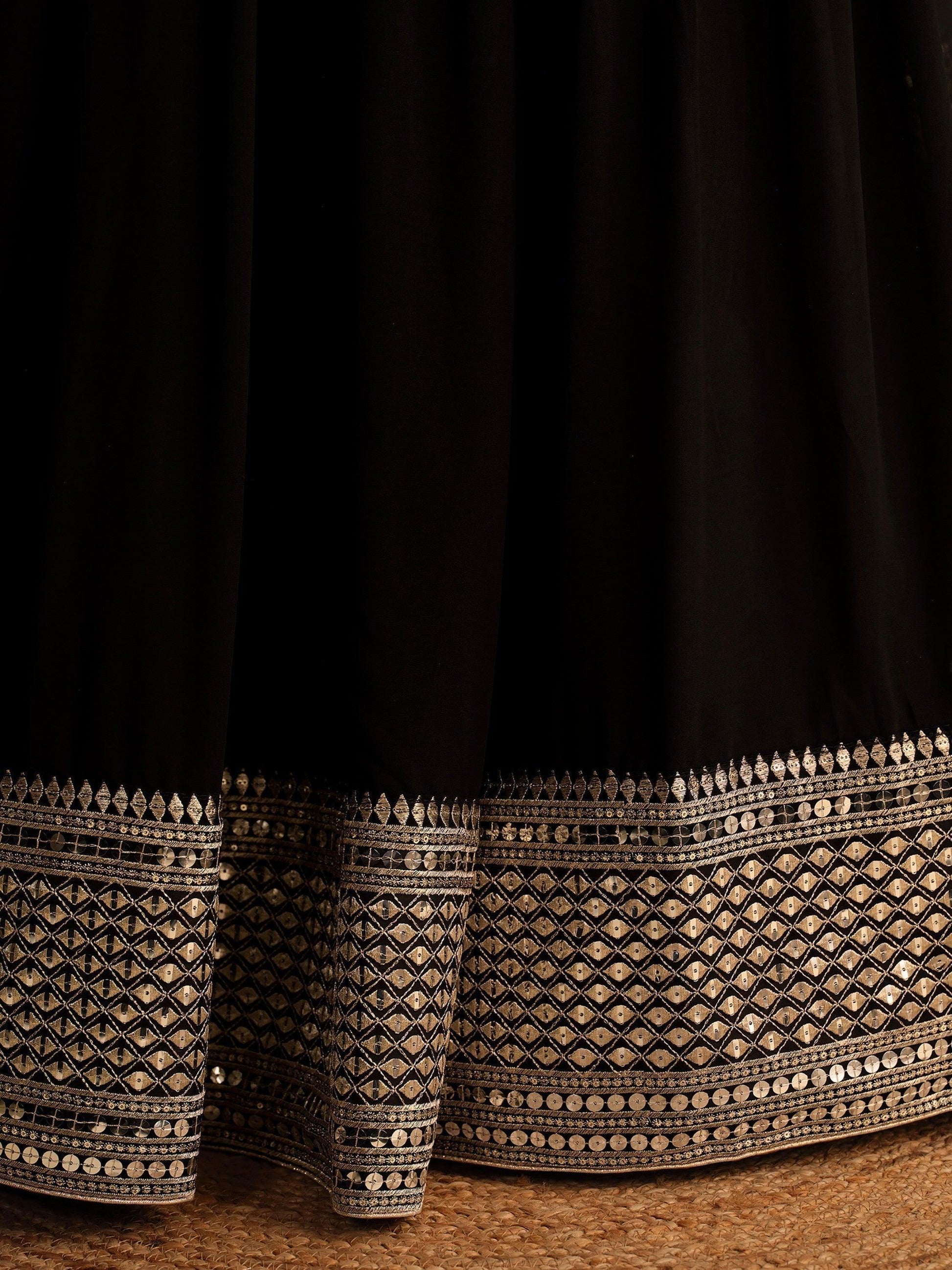 • And matching unstitched choli adorned with intricate thread embroidery and sequins. and also black georgette dupatta is beautifully embellished with sequin work, thread embroidery, and fancy lace detailing.