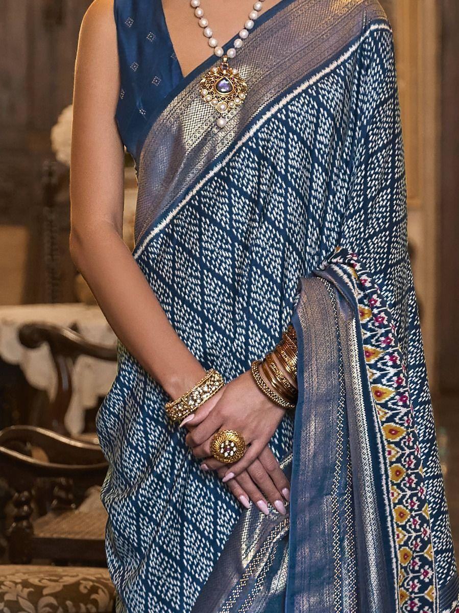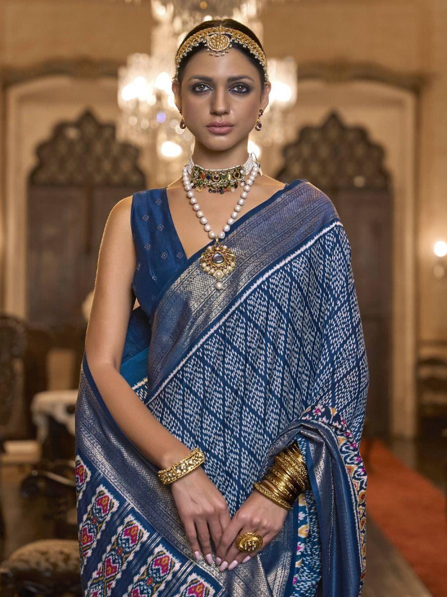 • Add more charm and elegance to your wardrobe with this attractive blue printed patola silk festival wear saree with blouse. This exquisite saree is perfect for any occasion, be it a festival, event, casual, or wedding.