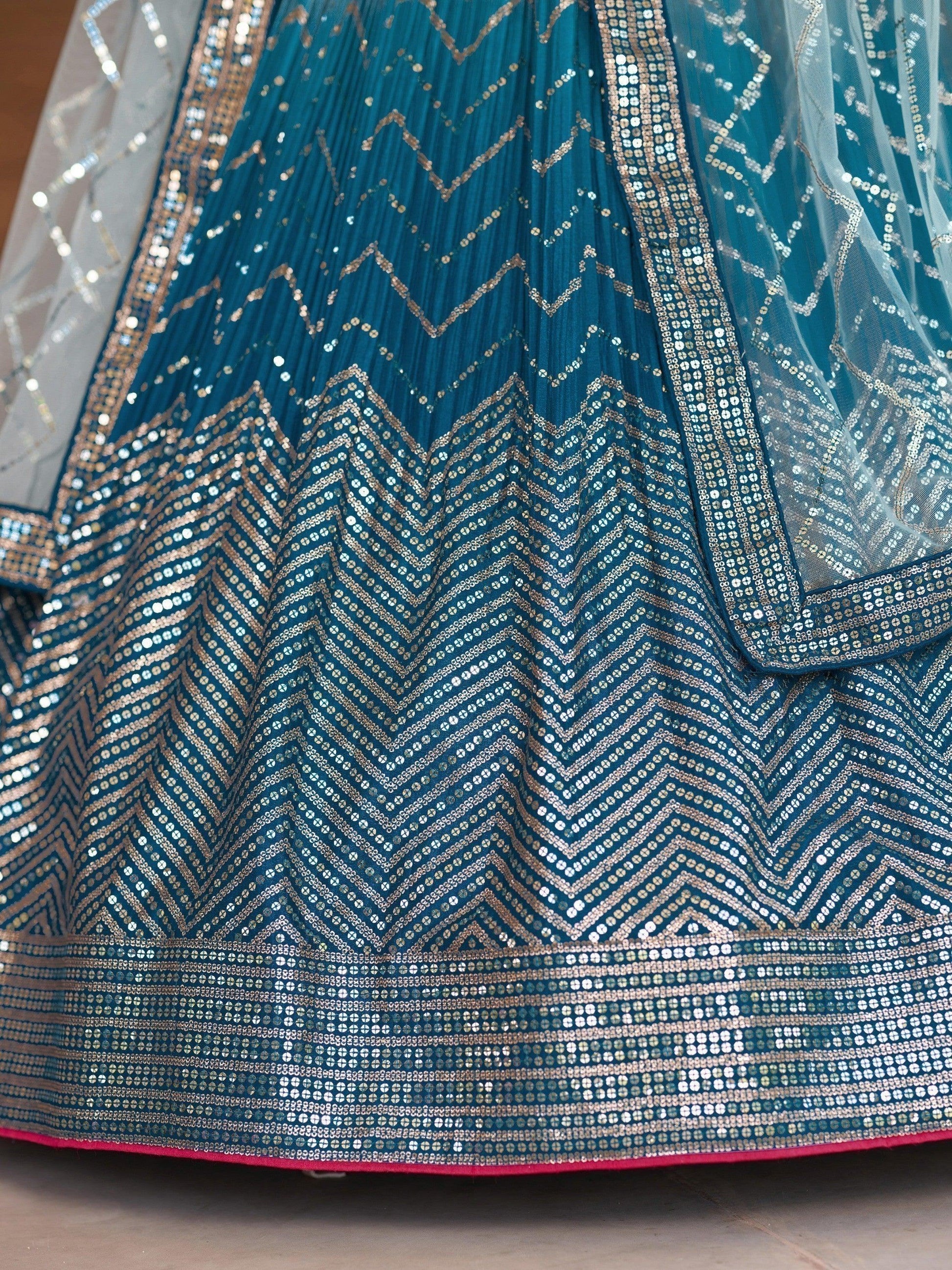 • Elevate your ethnic wear collection with this stunning awesome teal blue sequins chinon sangeet wear a lehenga choli with a dupatta. Crafted from high-quality teal blue chinon material, this outfit is adorned with intricate zig-zag sequins and embroidery work, adding a touch of elegance and glamour to your look.