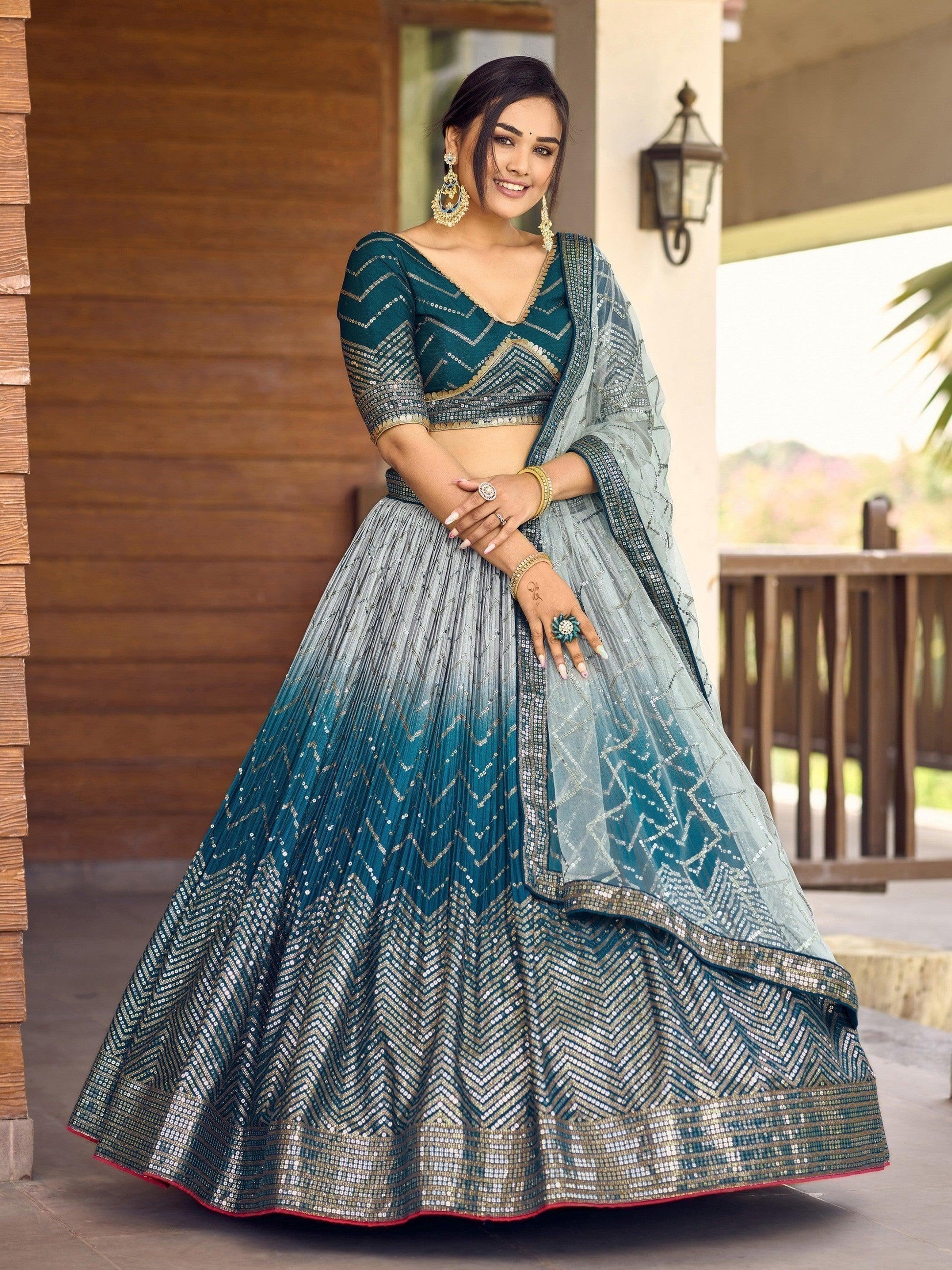 • Get ready to dazzle at any occasion with our stunning teal blue chinon lehenga choli with intricate zig-zag sequins and embroidery work.