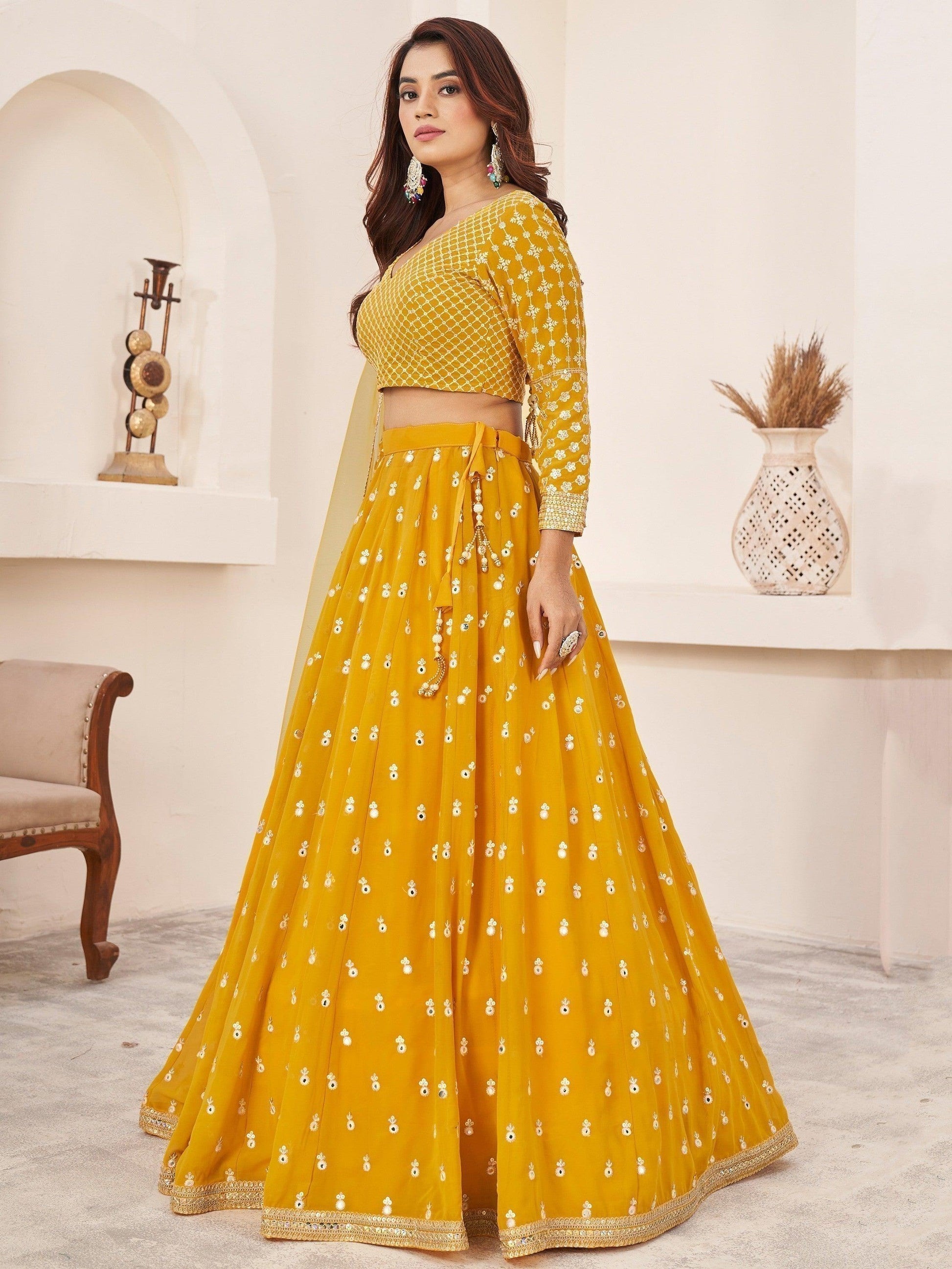 • Our "beauteous yellow thread work georgette lehenga choli with dupatta" is a must-have for any fashion-forward individual looking to make a statement at any celebration. With its beautiful craftsmanship, customizable fit, and versatile styling options, this ensemble is a timeless addition to your ethnic collection. Upgrade your wardrobe with this exquisite lehenga choli today and be the epitome of style and sophistication.