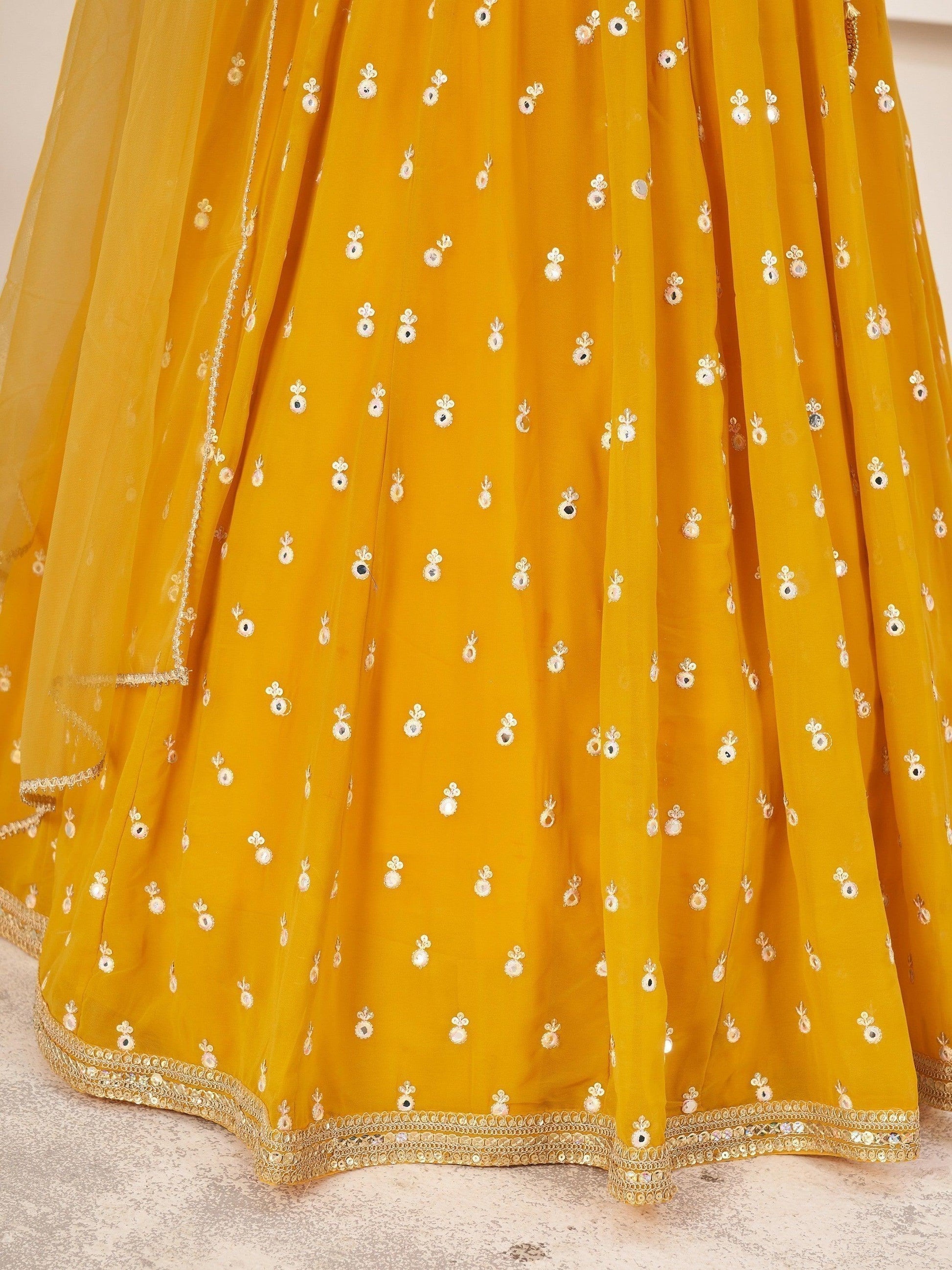 • Embark on a journey of elegance and tradition with this exquisite yellow georgette lehenga choli, intricately adorned with multi-colored thread and sequins embroidery that radiates a timeless charm.