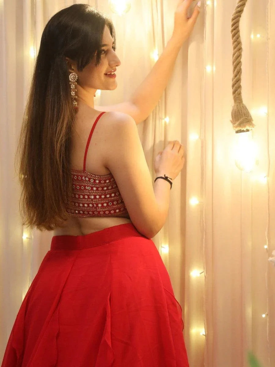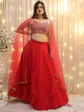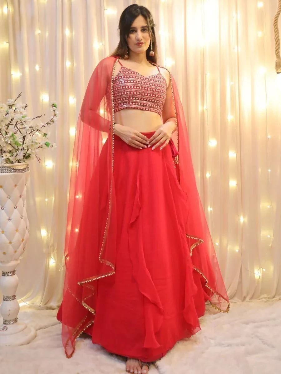 • Experience the glamour and grace of Indian fashion with this exquisite red georgette lehenga choli with dupatta. Shop online now at Zeel Clothing.