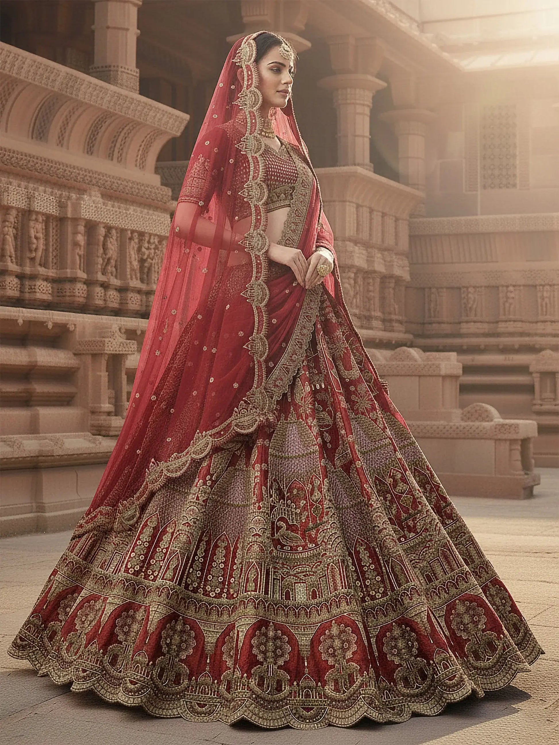 • This maroon or bridal red lehenga choli in heavy silk delivers a rich, structured silhouette, with its substantial texture and full-bodied drape providing the perfect base for the intensive, high–end embroidery that defines this ceremonial masterpiece.