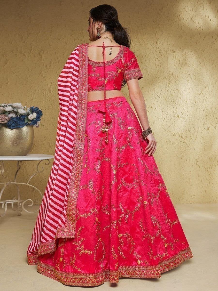 • Introducing our charming pink embroidered silk wedding wear lehenga choli. Made from beautiful art silk material, this pink lehenga choli is adorned with intricate thread embroidery, giving it an elegant and stunning look.