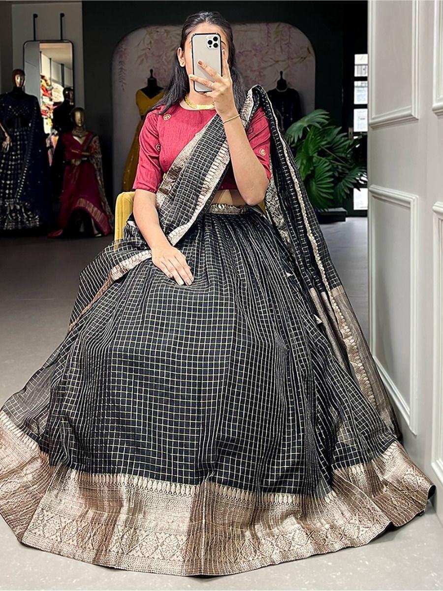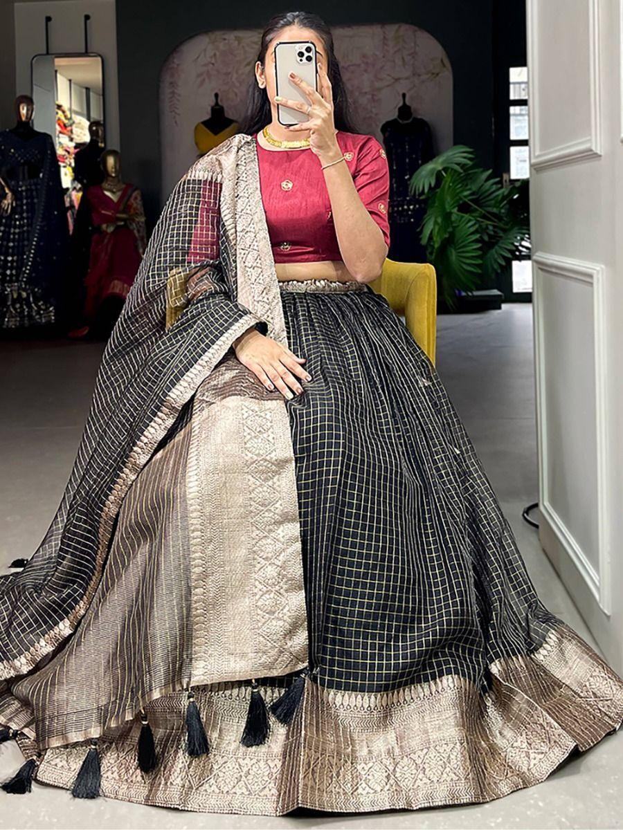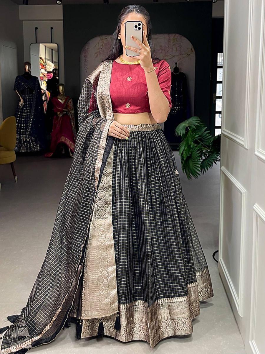 • Introducing the "dazzling black zari weaving organza traditional lehenga choli". This stunning ensemble features a black-color organza material lehenga with exquisite zari weaving work, creating a truly mesmerizing look.