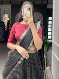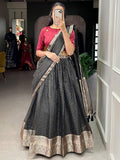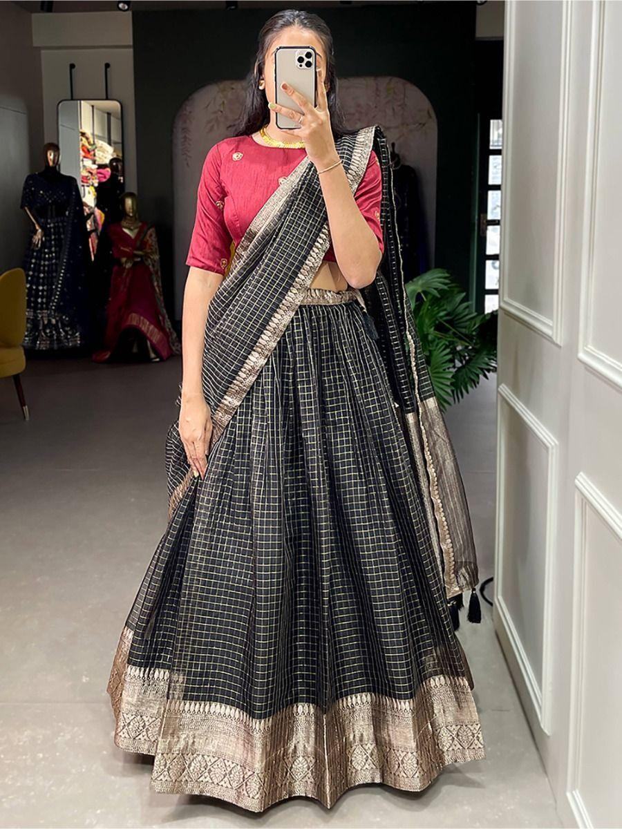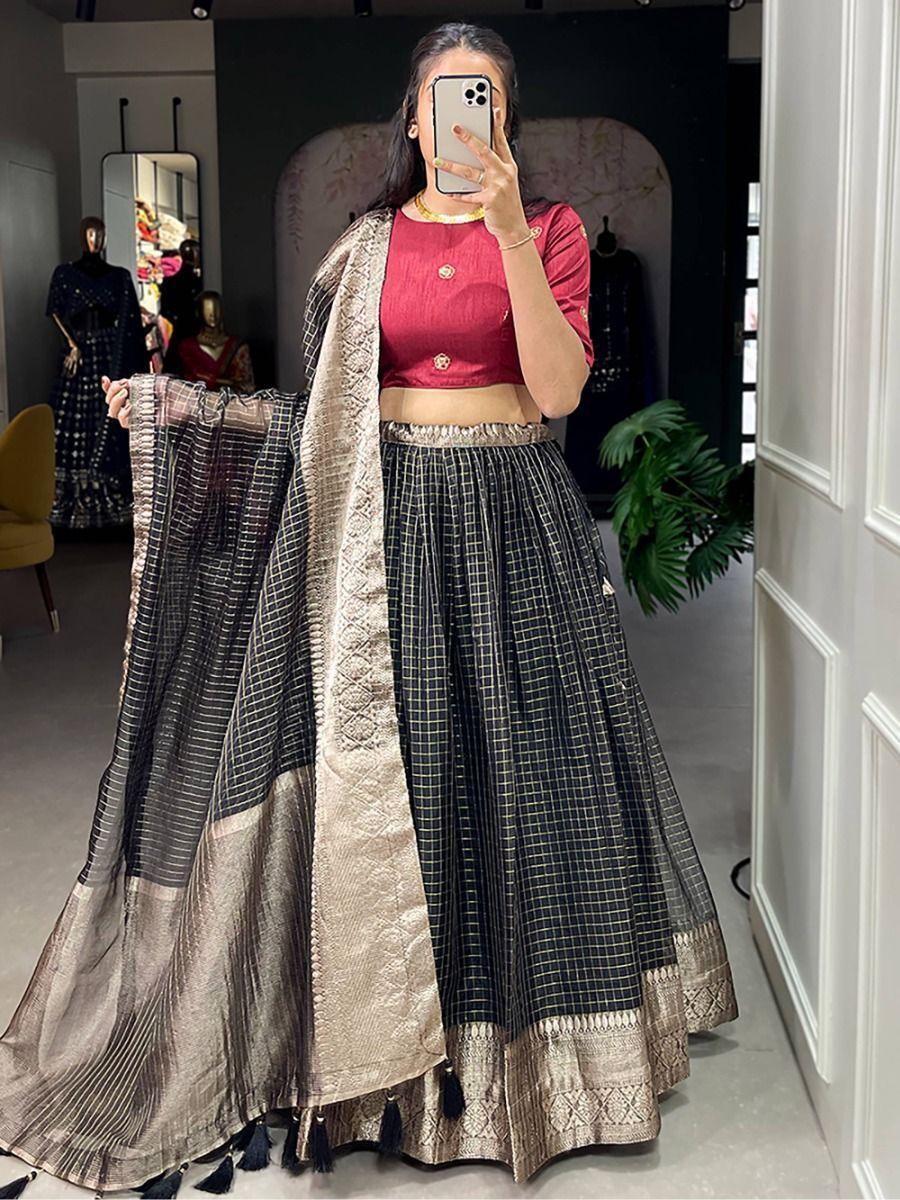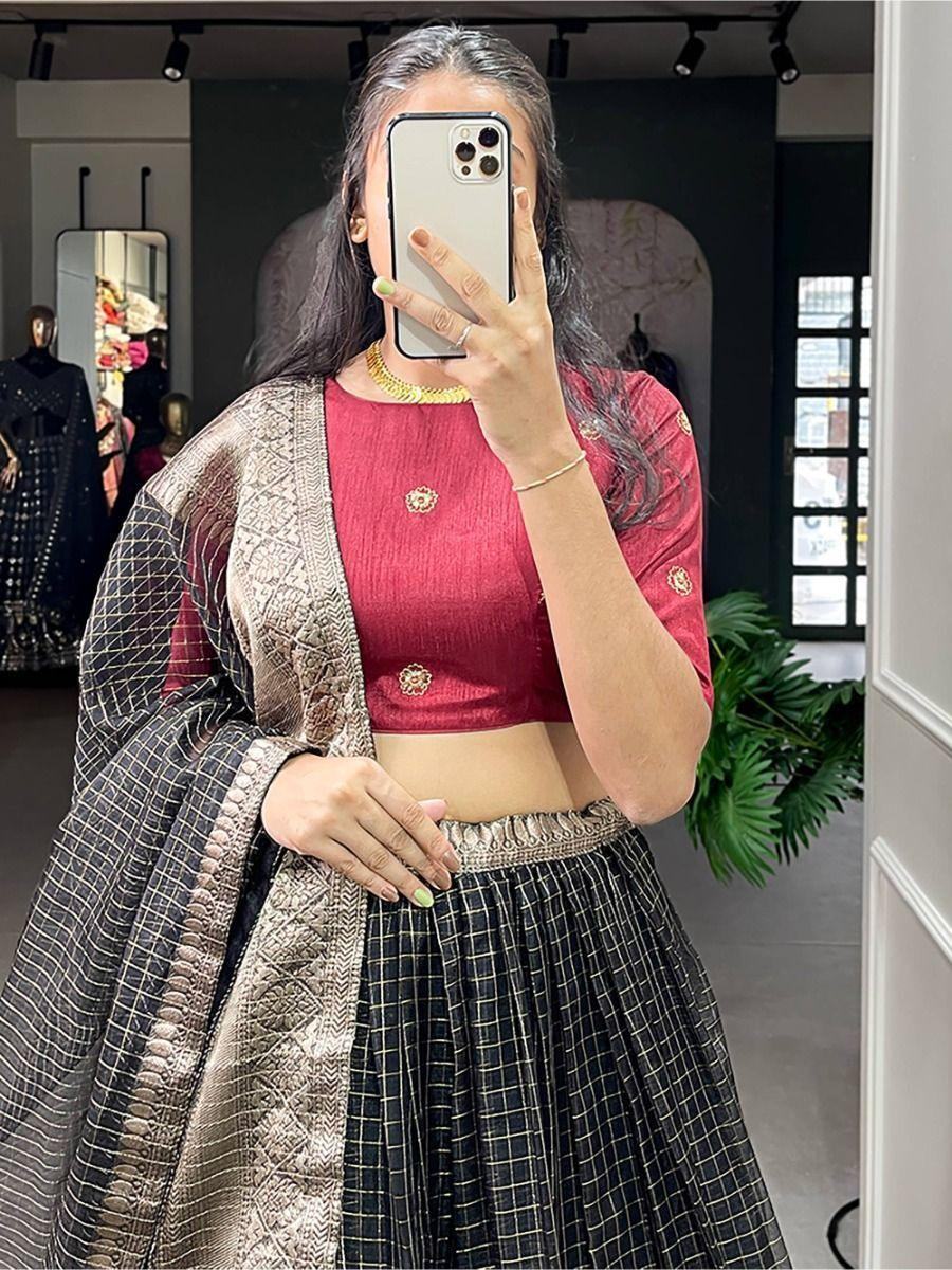 • Introducing the "dazzling black zari weaving organza traditional lehenga choli". This stunning ensemble features a black-color organza material lehenga with exquisite zari weaving work, creating a truly mesmerizing look.