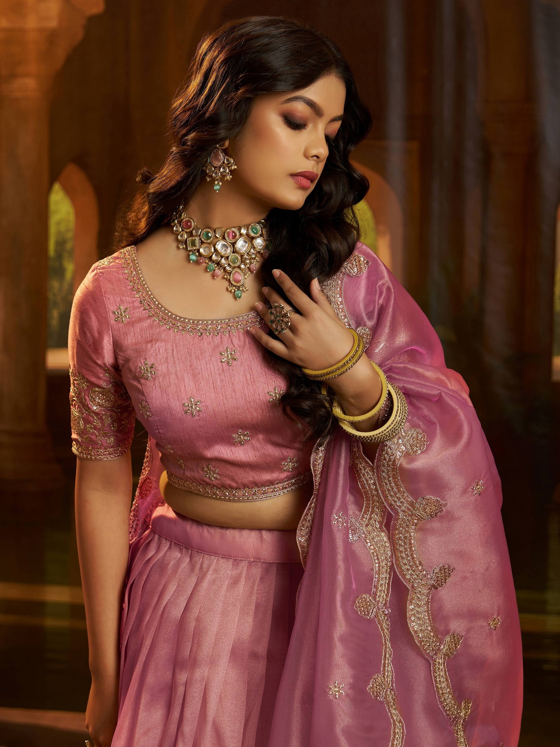 • Complementing the lehenga is an unstitched blouse made from premium Banglori silk in a matching blush pink tone. The blouse features coordinated sequins, zari, and dori embroidery in an elegant floral motif, highlighted around the neckline, sleeves, and body. Supplied in a 1.20-meter length, it allows full customization of fit, neckline style, and sleeve design.