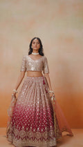 • The maroon lehenga features a stunning two-tone shaded georgette fabric, enriched with intricate zari embroidery and shimmering sequins work. Designed with back and front embellishments and adorned with elegant latkans, it brings festive glamour to life.
