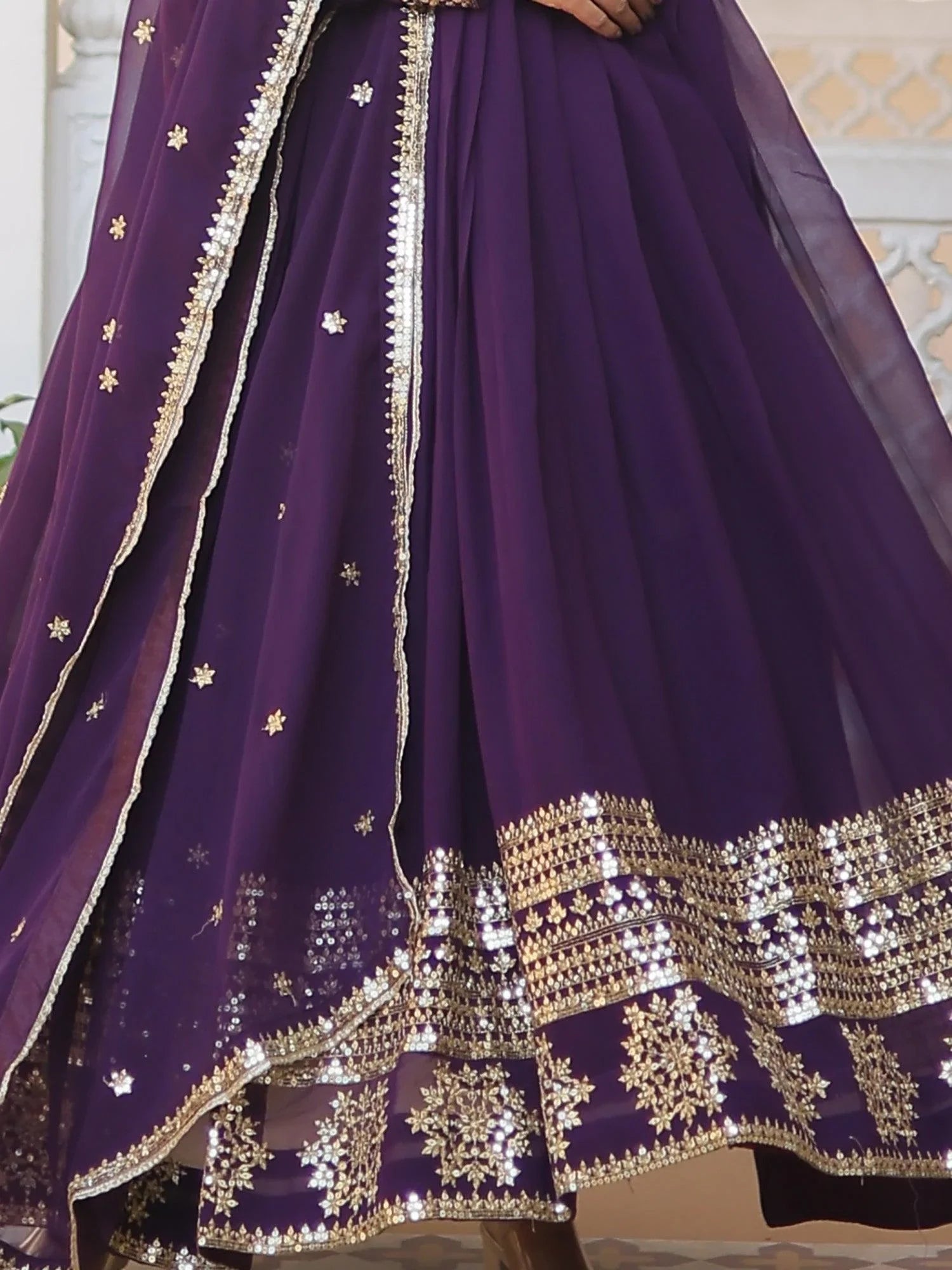 • Introducing our fabulous purple sequins georgette festival wear gown with dupatta, a stunning outfit that will make you stand out at any festive occasion. Made from charming purple georgette material, this readymade gown is elegantly embroidered with golden thread and sequins work, giving it a touch of luxury and sophistication. The similar color georgette dupatta complements the gown perfectly with its sequins embroidered work and designer lace details.