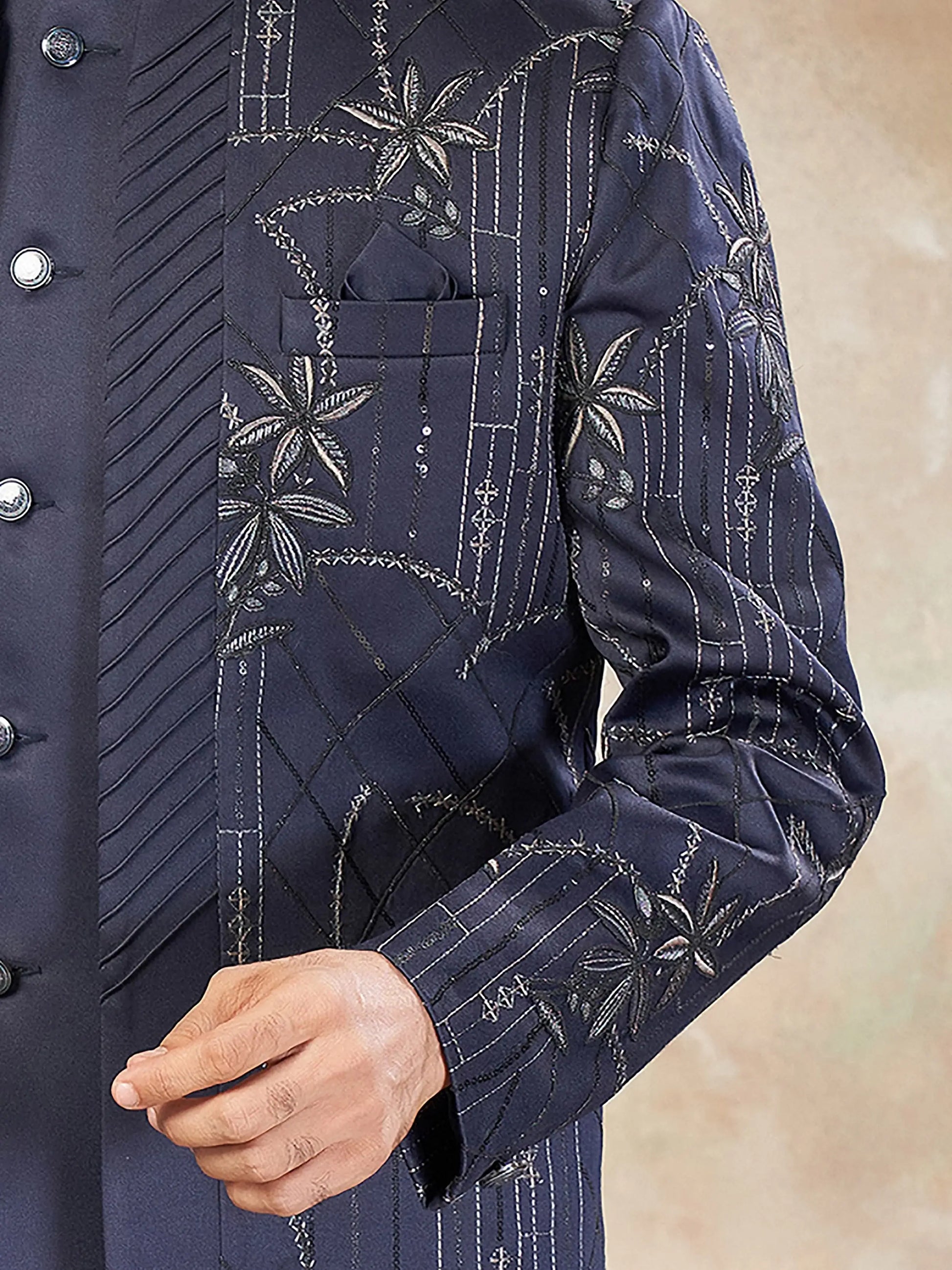 • The jacket features a sharp bandhgala collar and tailored silhouette, highlighted with delicate thread embroidery and subtle sequin work in floral and leaf-inspired patterns.