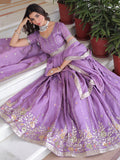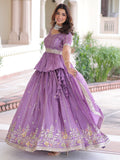 • This graceful lehenga with peplum top is designed in a soft lavender-purple tone, crafted from luxurious gold crush fabric and highlighted with elegant pattern-style embroidery. The lehenga is fully stitched and available in L size, featuring multi-thread embroidery enhanced with zari and sequin work that adds a subtle festive shimmer.
