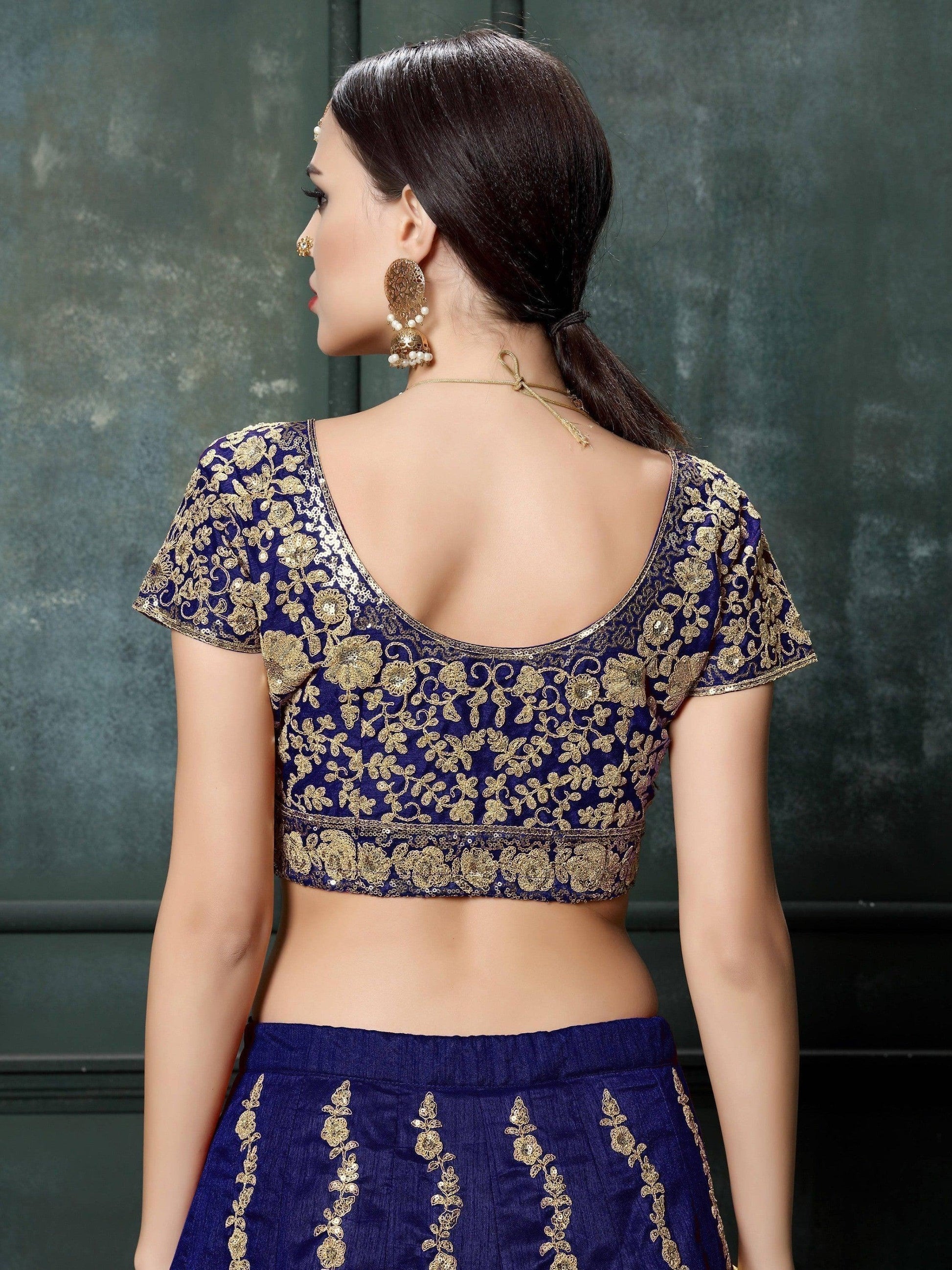 • This semi-stitched lehenga can be easily customized up to 42 inches, offering a perfect fit for every body type. Additionally, the lehenga choli length can be adjusted up to 43 inches, ensuring a comfortable and flattering silhouette. Whether it's a wedding, special event, or any festive occasion, women can effortlessly glam up with this navy blue lehenga choli.
