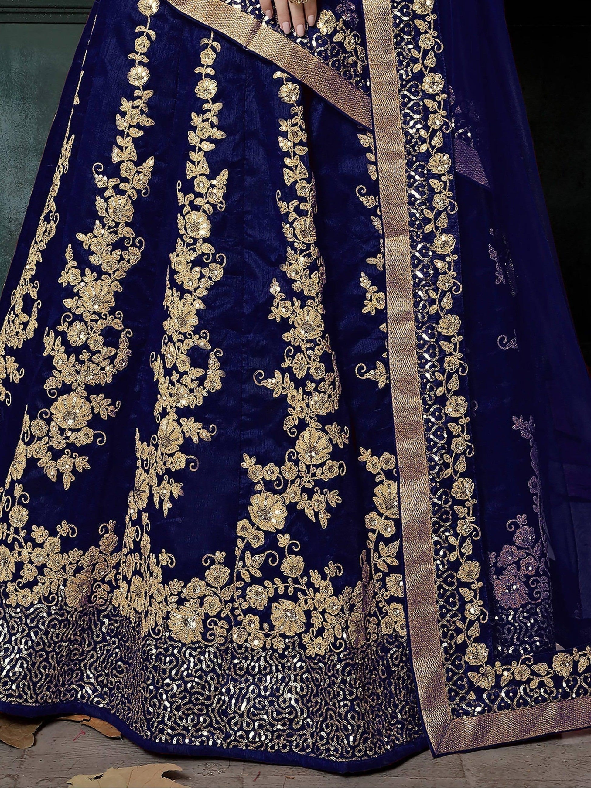 • The rich navy blue hue of this lehenga choli exudes sophistication and elegance, making it a perfect choice for special occasions. The heavy dori and sequins embroidery work on the lehenga choli and dupatta adds a touch of glamour and finesse. The semi-stitched lehenga can be customized up to 42 inches, ensuring a perfect fit for every body shape.