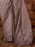 • This stunning saree is crafted from premium tussar silk fabric in a soft smoky taupe / muted grey tone, highlighted by its natural texture and subtle sheen. The fabric flows effortlessly, giving the saree a refined and graceful presence that feels both rich and understated.