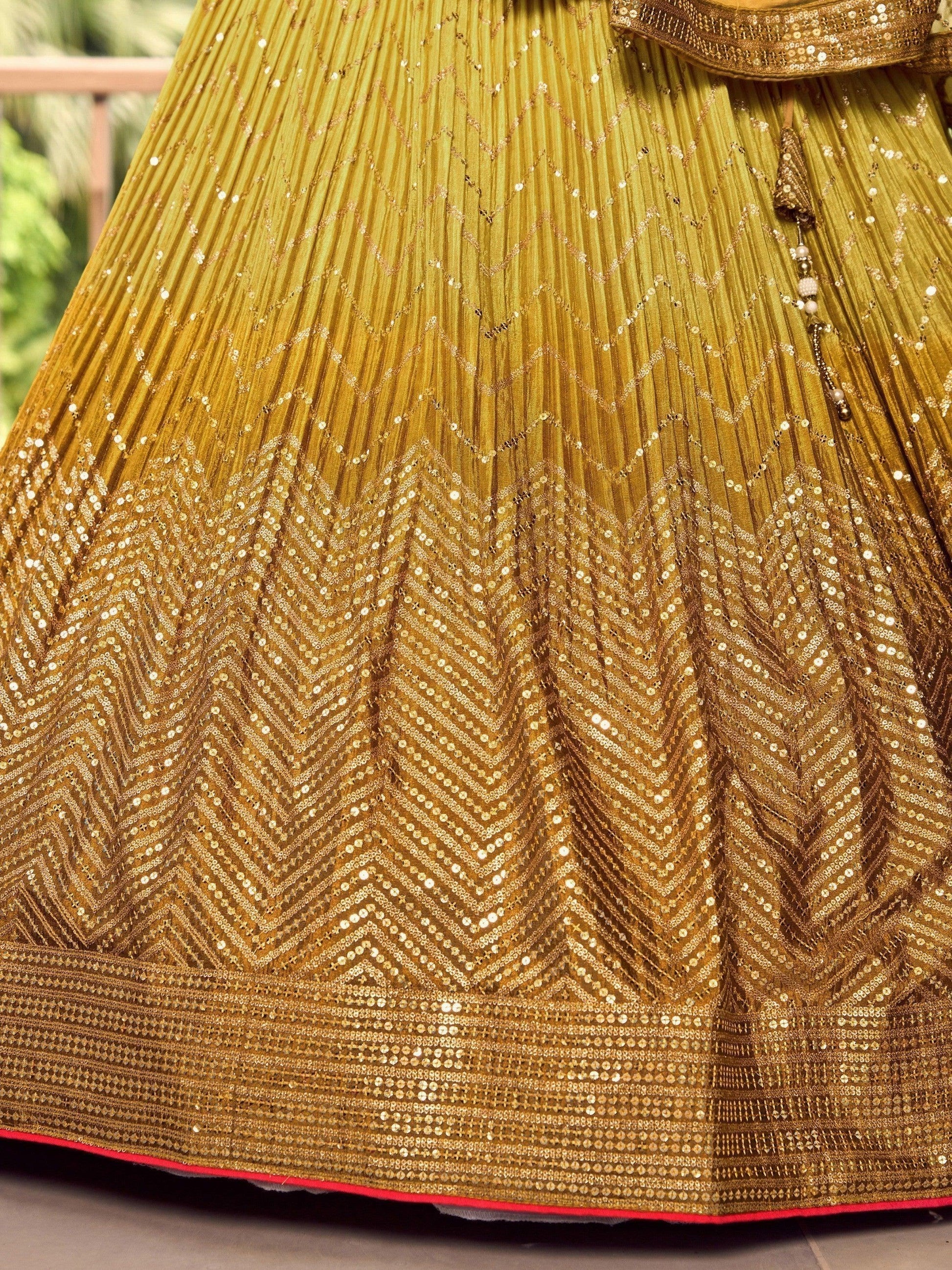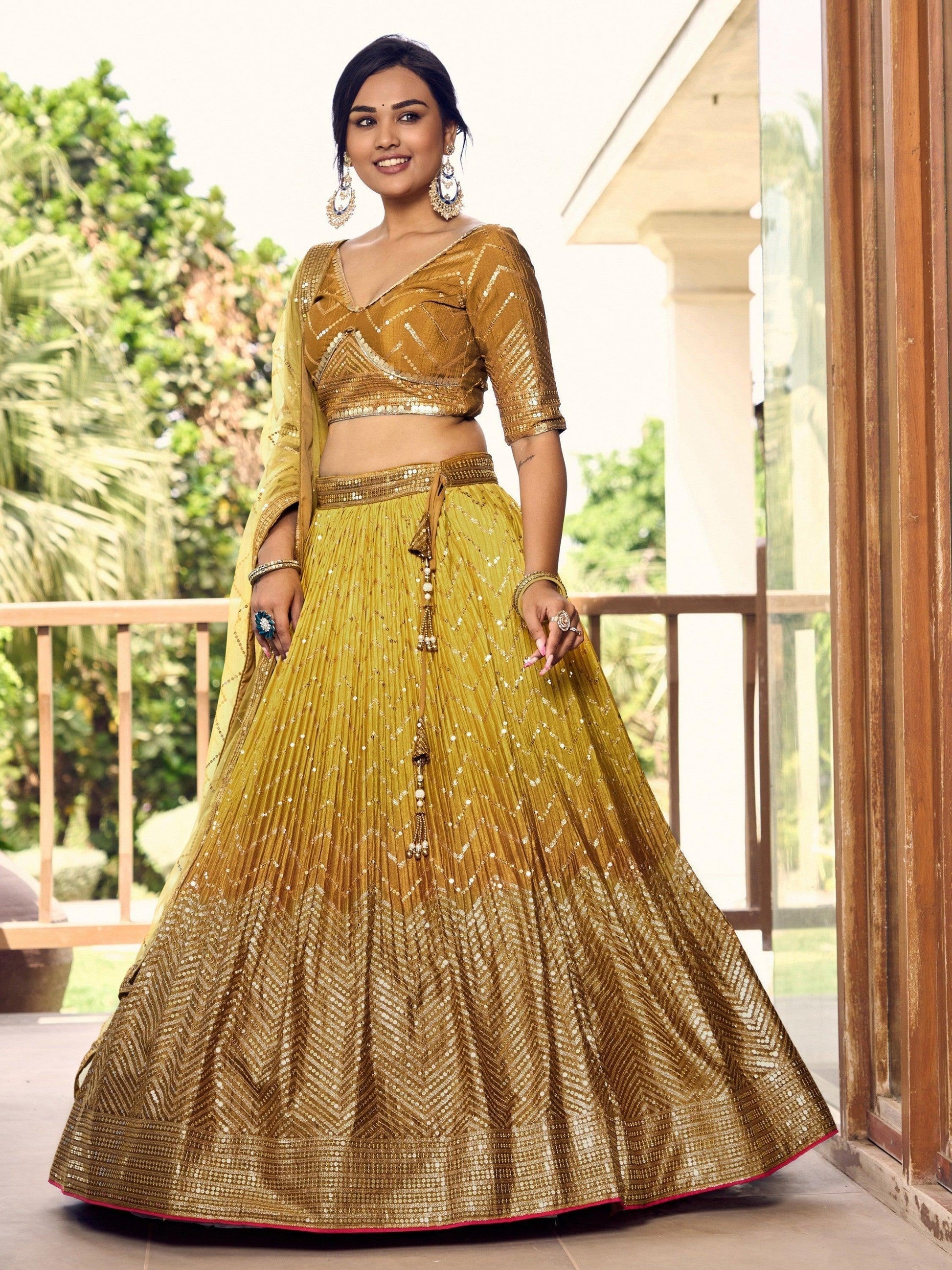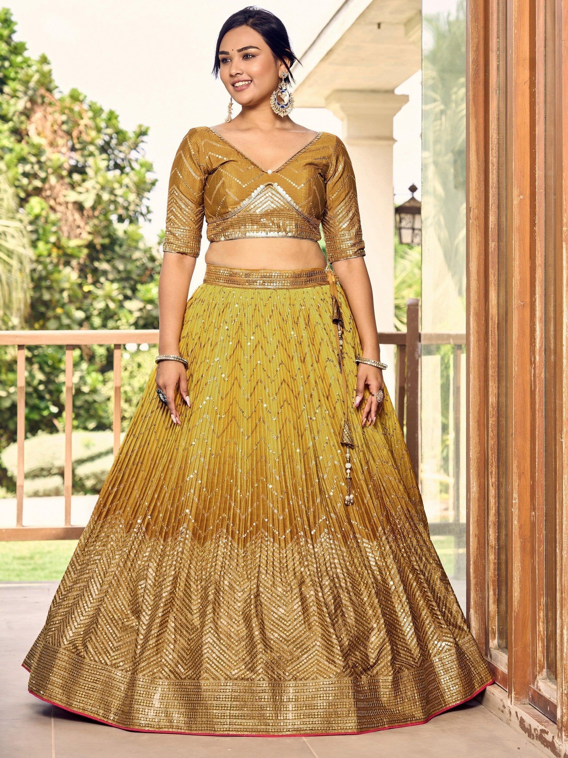• Introducing our incredible yellow sequins chinon haldi wear lehenga choli with a dupatta, a stunning ensemble that will make you stand out on any special occasion. Made from high-quality yellow chinon material, this lehenga choli is intricately worked with zig-zag sequins and embroidery, giving it a gorgeous and elegant look.