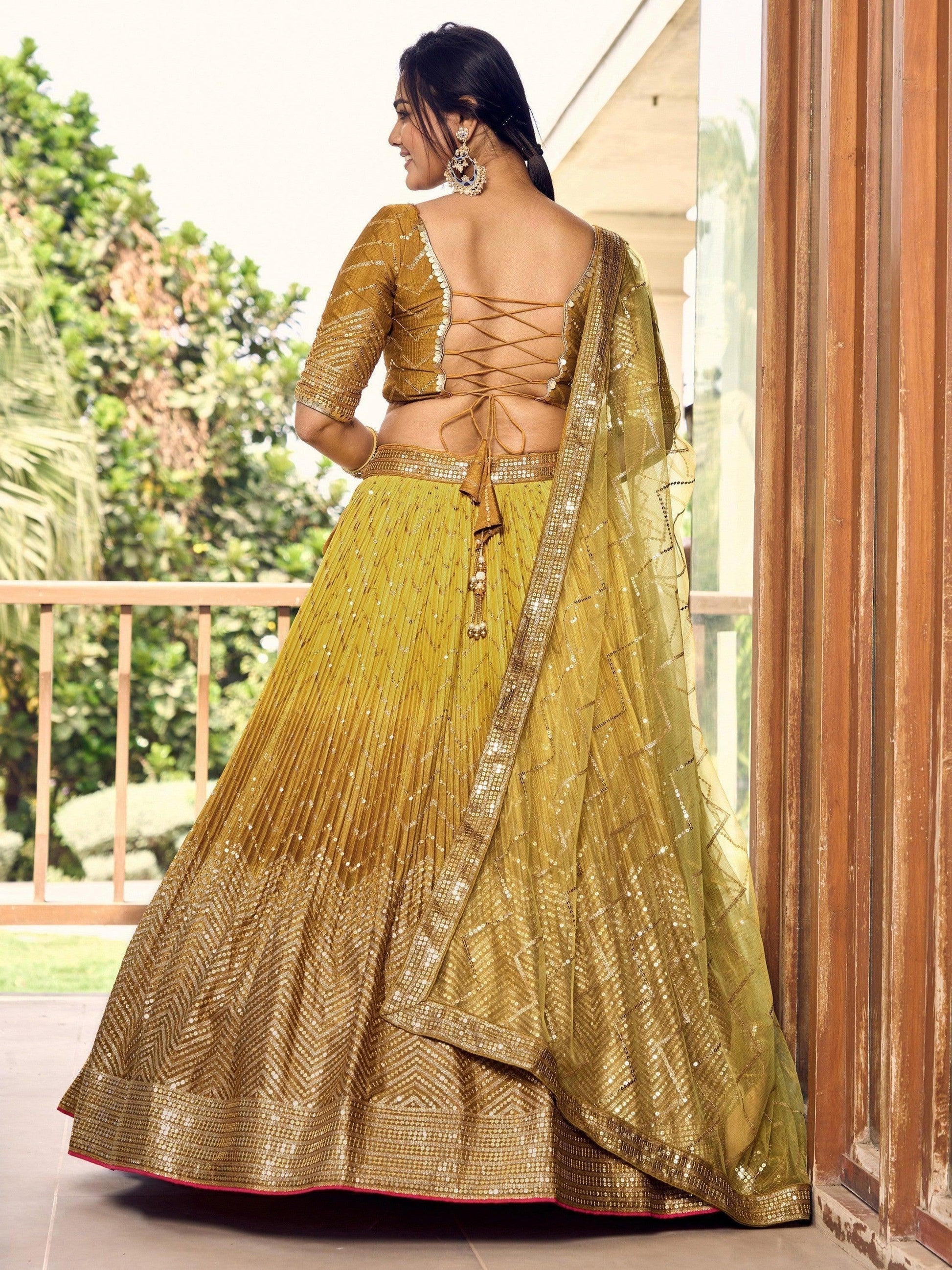• Our yellow sequins chinon haldi wear lehenga choli with a dupatta is not only stylish but also comfortable to wear, allowing you to move and dance with ease. The vibrant yellow color is perfect for adding a pop of color to your wardrobe, while the intricate sequins and embroidery work add a touch of glamour and sophistication. This outfit is sure to turn heads and make you feel like a princess on your special day.