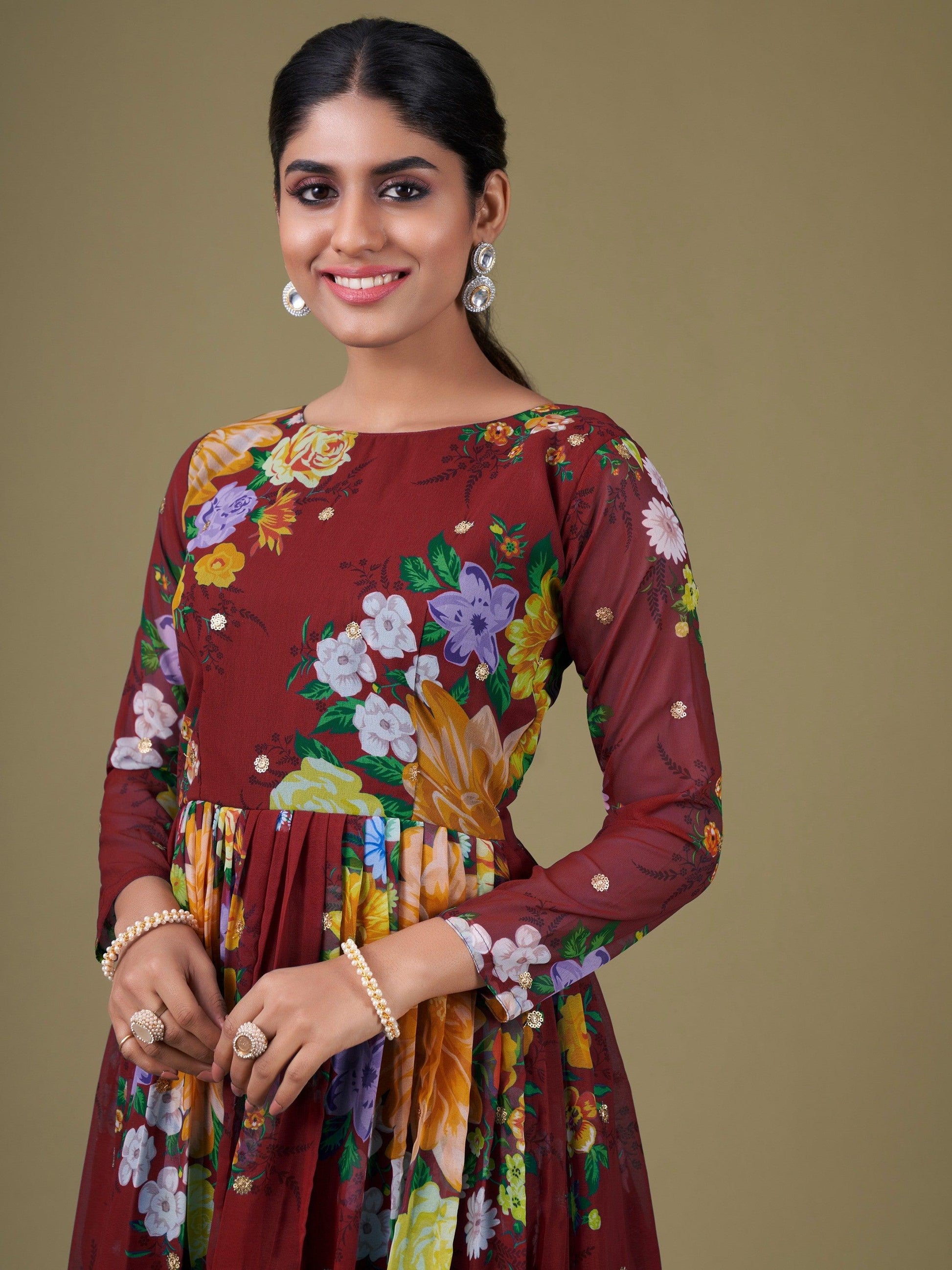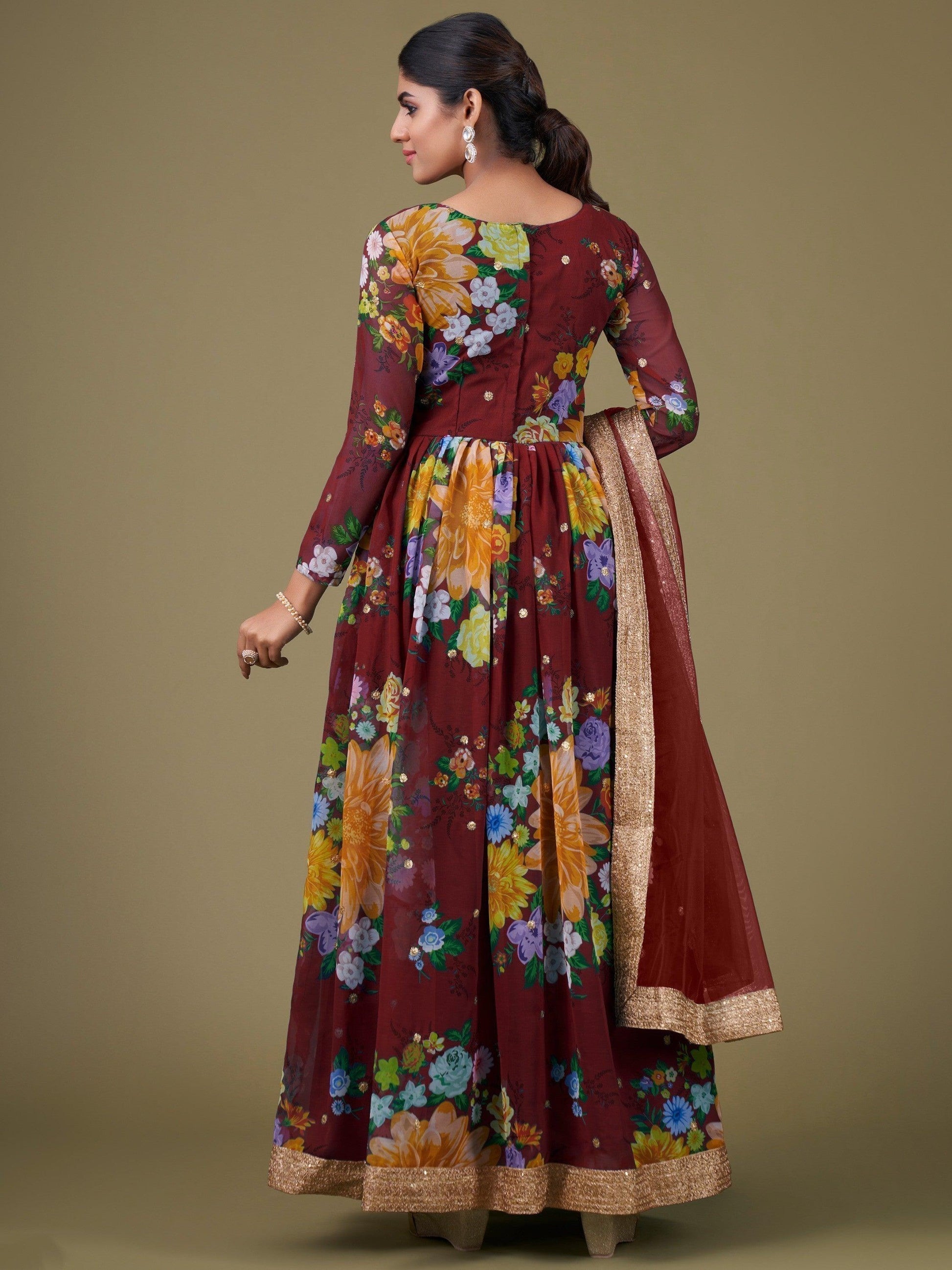Lovely Maroon Floral Printed Georgette Festive Wear Gown With Dupatta