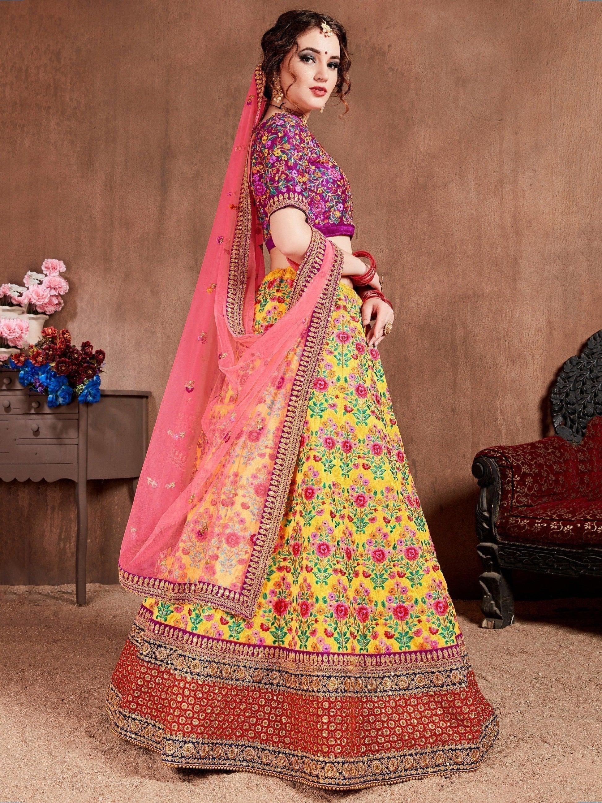 • Elevate your bridal look with our stunning lovely yellow colored bridal wear embroidered lehenga choli.