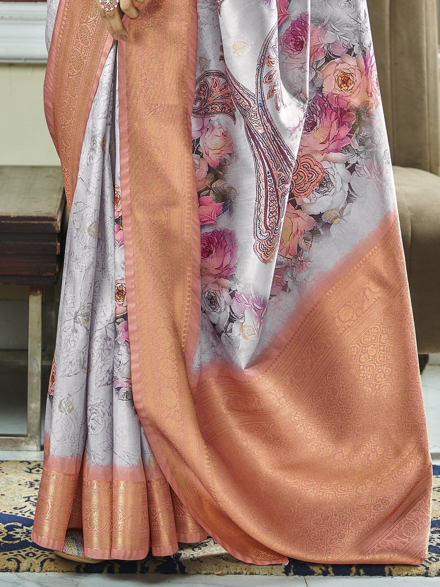 • Elevate your style with this exquisite grey floral printed silk saree, adorned with intricate zari weaving work and charming tassels on the pallu.