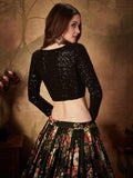 • This black-colored lehenga choli has been designed using organza silk lehenga and decorated with floral print all over accompanied by a sequin lace border.