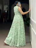 • This western wear dress comes in a soothing pastel green shade with delicate all-over floral prints, crafted from lightweight georgette fabric for an airy and graceful fall.