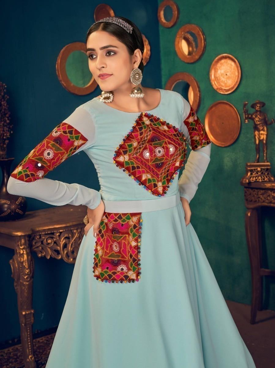 • This blue color gown is made of georgette material embellished with embroidered work, a real mirror, and pearl work with a waist belt and pocket.