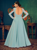 • Present an energetic highlight to your ethnic attire by donning this lovely sky-blue color gown.