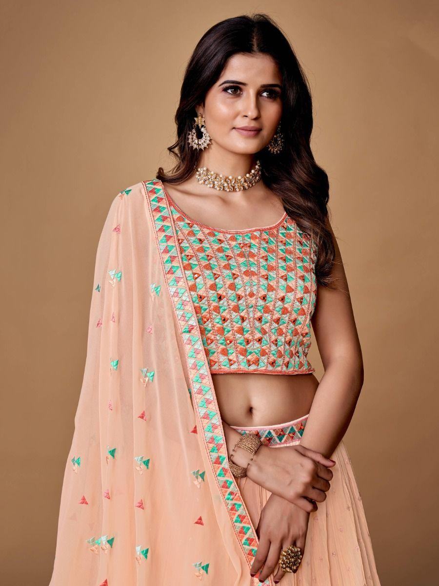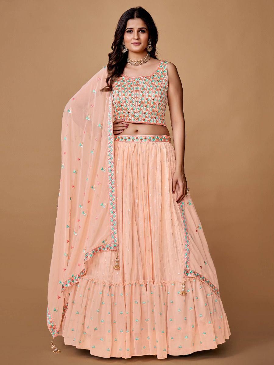 • This peach lehenga reaches with a similar color of georgette material choli formed with heavy embroidery and mirror work. It also comes with a similar color georgette material dupatta developed with sequins work and lace work.