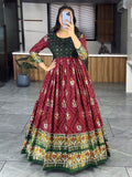 • Elevate your festive wardrobe with our ravishing maroon bandhani printed silk gown, perfect for any special occasion.