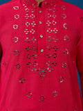 • Men’s hot pink viscose silk kurta with mirror work and subtle thread embroidery on the chest and hemline.
