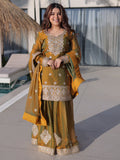 Sparkling Mustard Yellow Coding Work Chiffon Festive Wear Sharara Suit