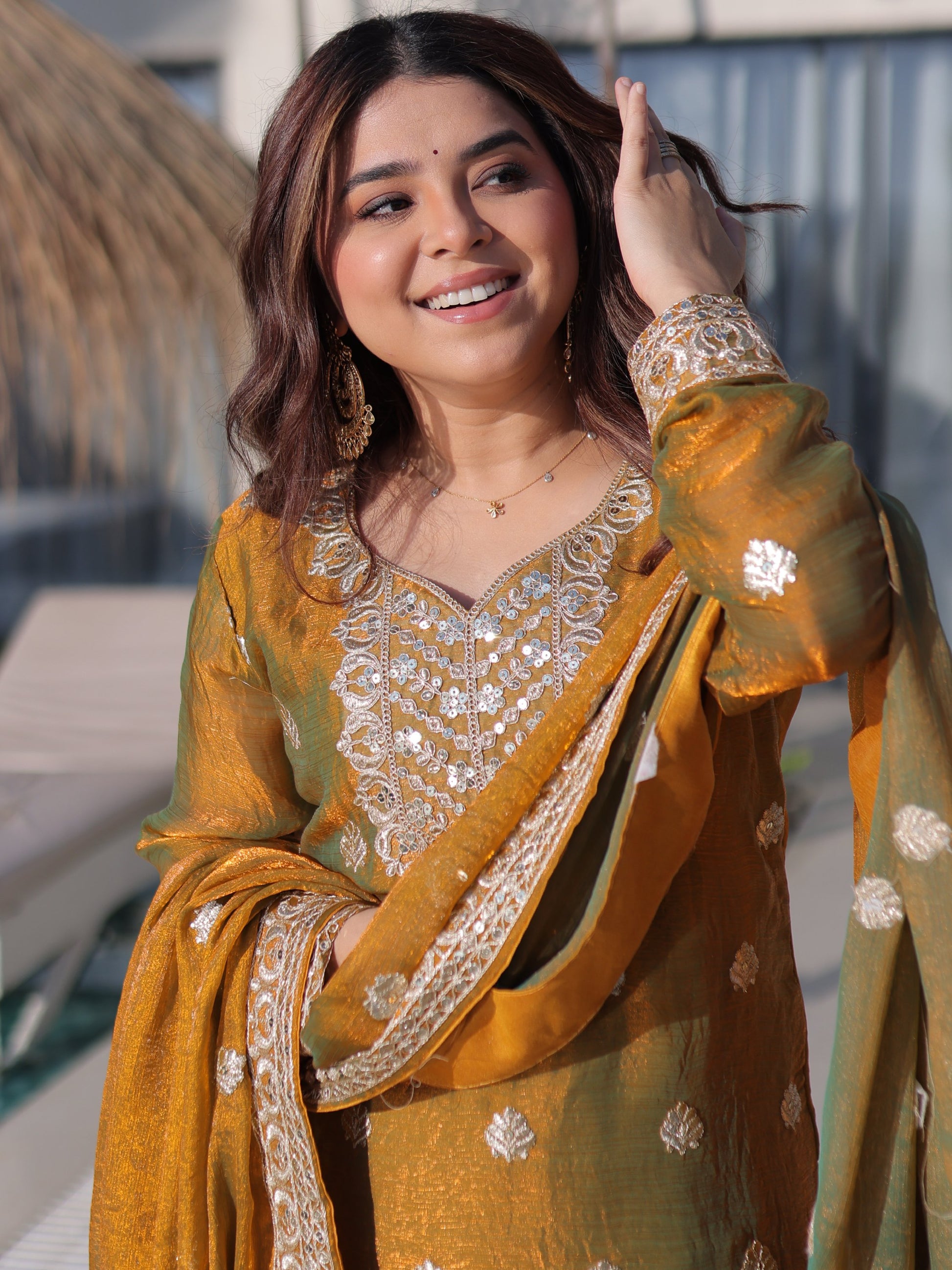 • The top features a rich mustard gold and olive green blend in chiffon with silver zari and sequin embroidery, full sleeves, V-neck, and 32-inch length.