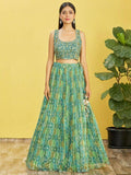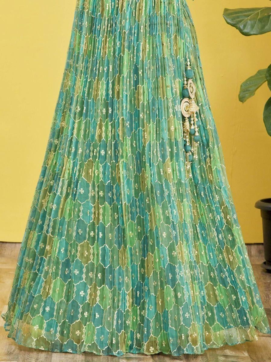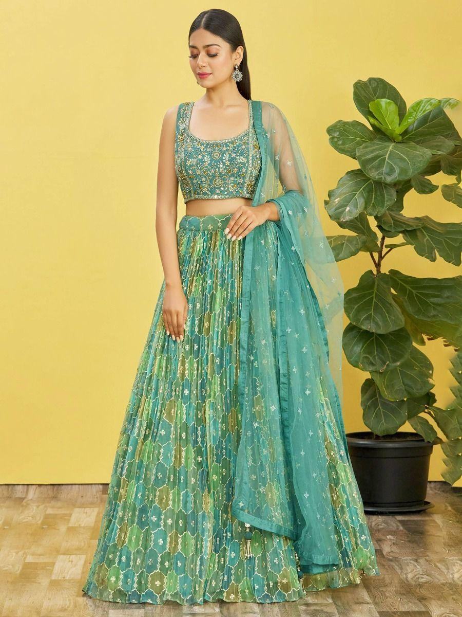 • Make the heads flip whenever you dress up with this stunning sea green color lehenga made of organza material embellished with real mirror work with thread work, zari work, sequins embroidered work, and digital print work