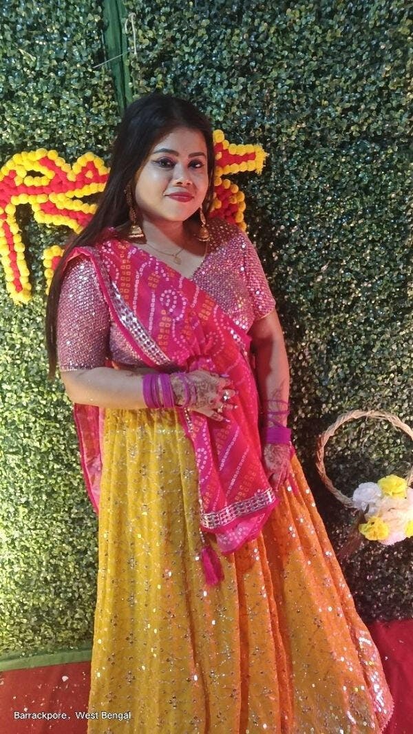 • This yellow georgette lehenga features sequins and zari embroidery, giving it a vibrant festive look. The light fabric adds flow and comfort, perfect for haldi celebrations.