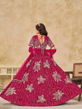 • The color features a rich rani pink / deep magenta tone, perfectly highlighted with champagne gold embroidery. The vibrant pink base paired with shimmering floral and leaf motifs creates a striking, luxurious, and eye-catching appeal.