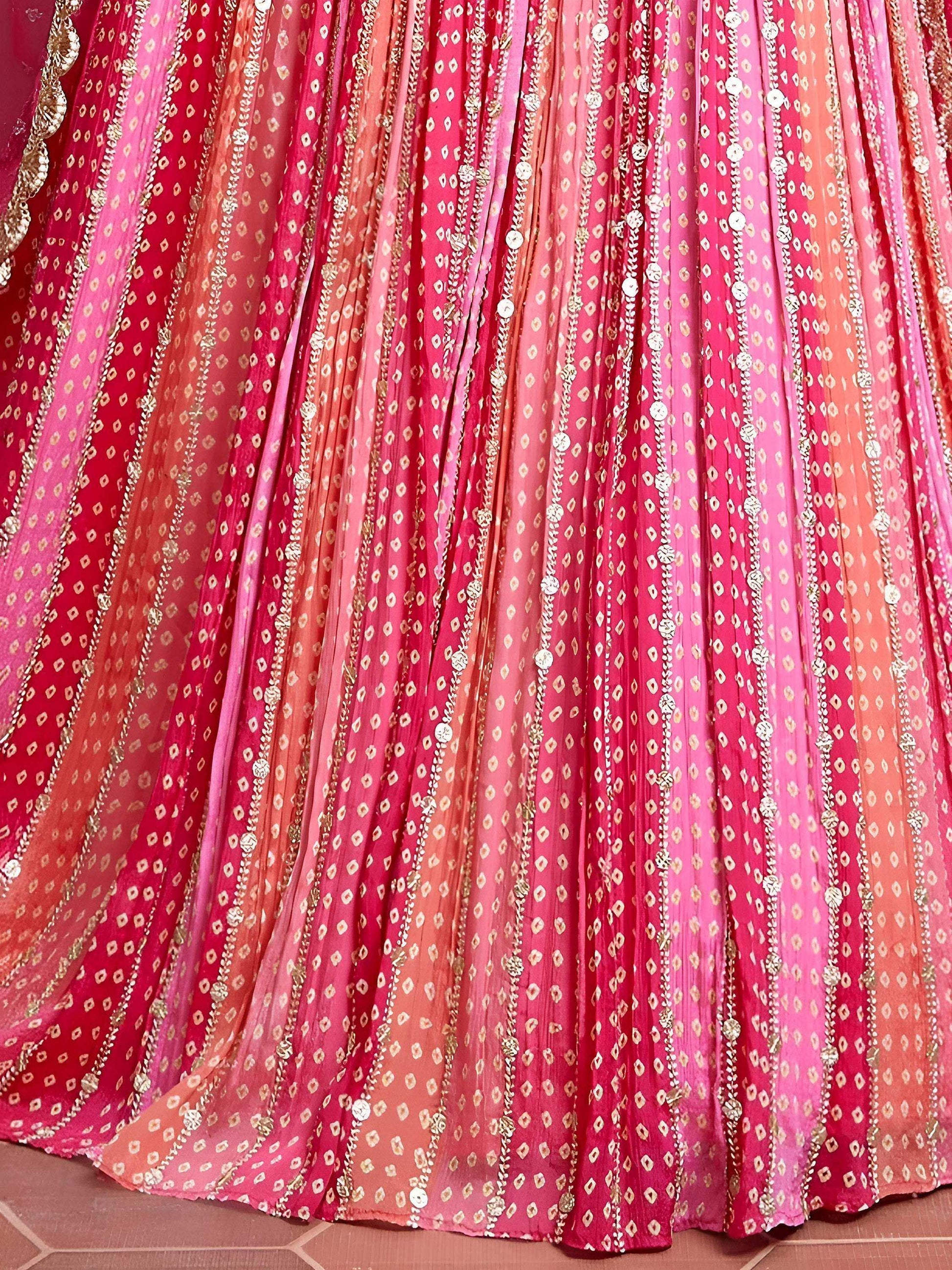 • Design and pattern could be at the rise of your beauty after you dress in this pink color lehenga formed with chinon silk material designed with sequins embroidery, digital print, and zari work.